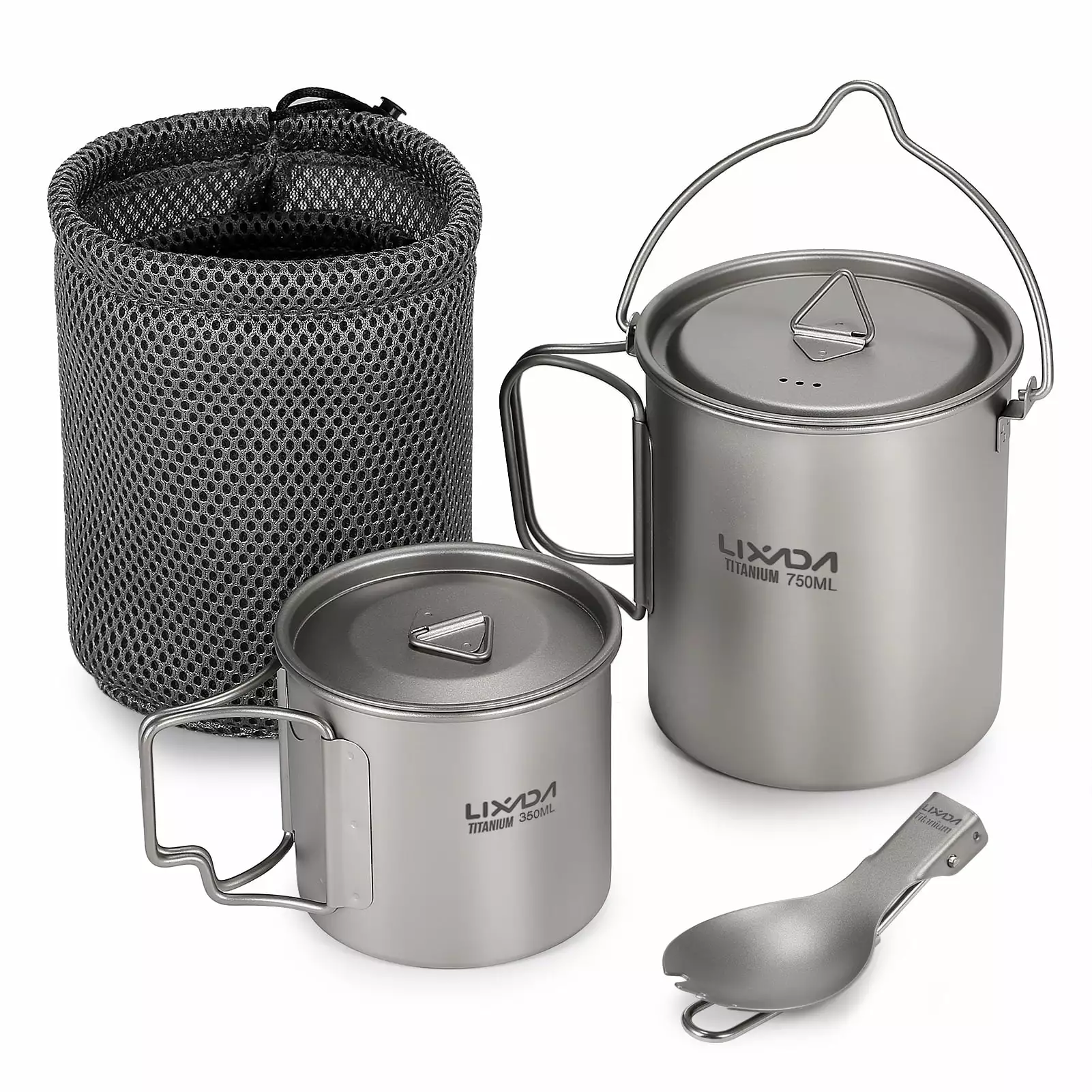 Lixada Lightweight Titanium 3 Pieces Set Titanium 750ml Pot 350ml Water Cup Mug with Lid Collapsible Handle Folding Spork for Outdoor Camping Hiking Backpacking: Collapsible handles for convenient use and storage. Movable bar on the spork to lock its handle open.Each part is well packed in a storage sack for compact storage. convenient to carry wherever you go.Full set includes a 750ml pot. 350ml cup and a folding spork. great for camping. hiking. backpacking. adventure and survival.Lightweight construction is corrosion-resistant and lasts for years. It imparts no taste and odor on food or beverage.With a lid to heat loss. Round edges for easy cleaning and improved heating efficiency.