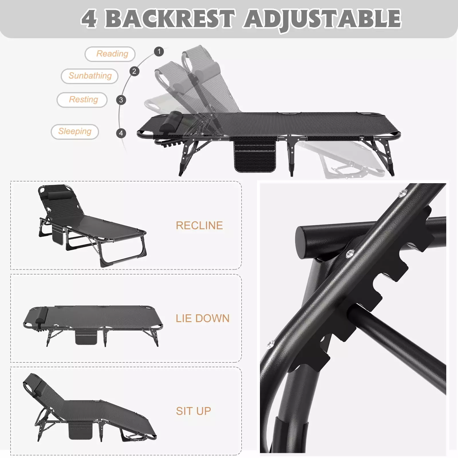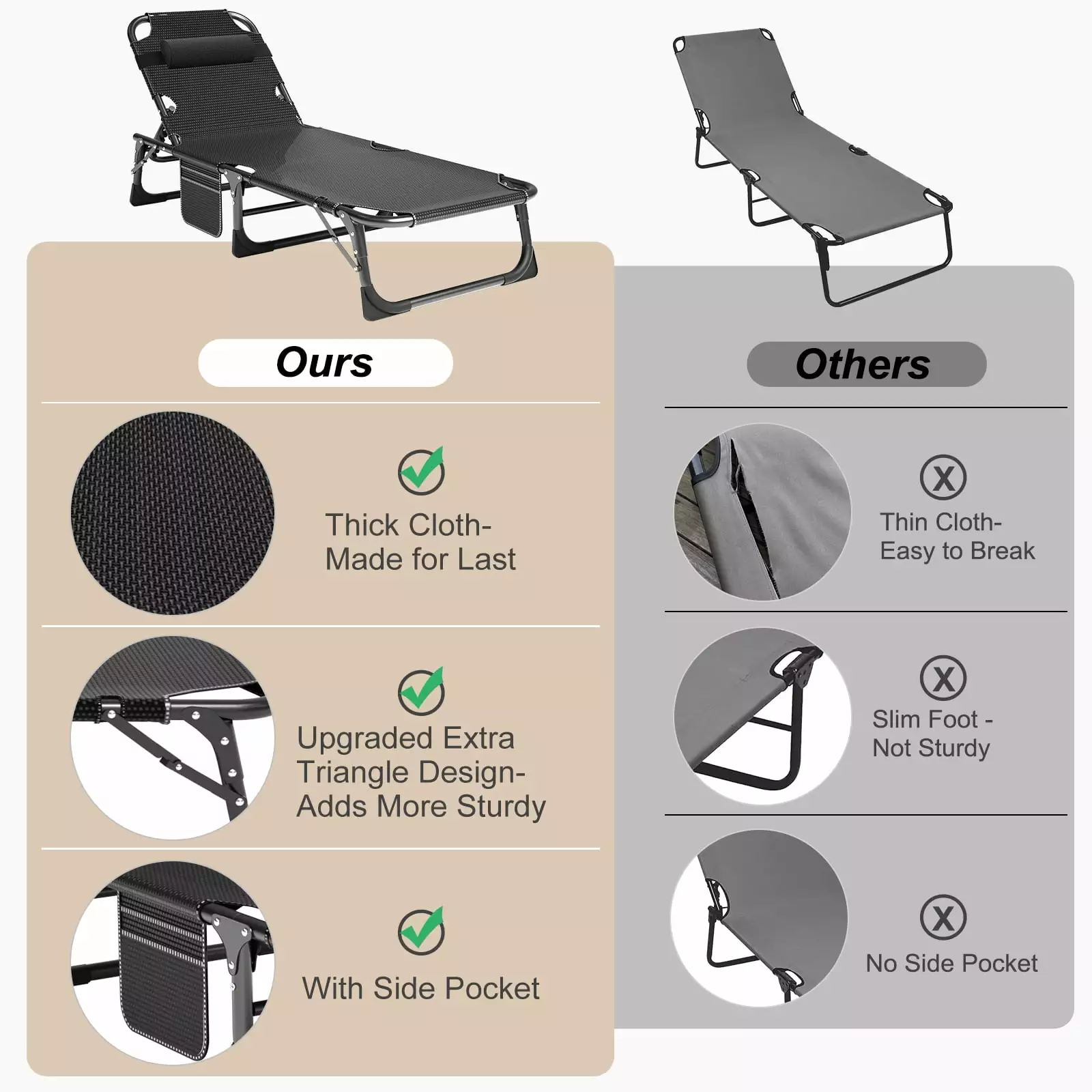 [SAFE AND COMFORTABLE]: The Frame of the adjustable lounge chair adopted by durable round tube.Weight capacity up to 400 pounds.Besides.the adjustable folding chair comes with a soft pad which is made by cotton.and it is soft for skin. comfortable and breathable. strong anti-wrinkle.Equiped with a removable pillow and side pocket to ensure a comfortable support for your neck and head when you are sleeping on it.