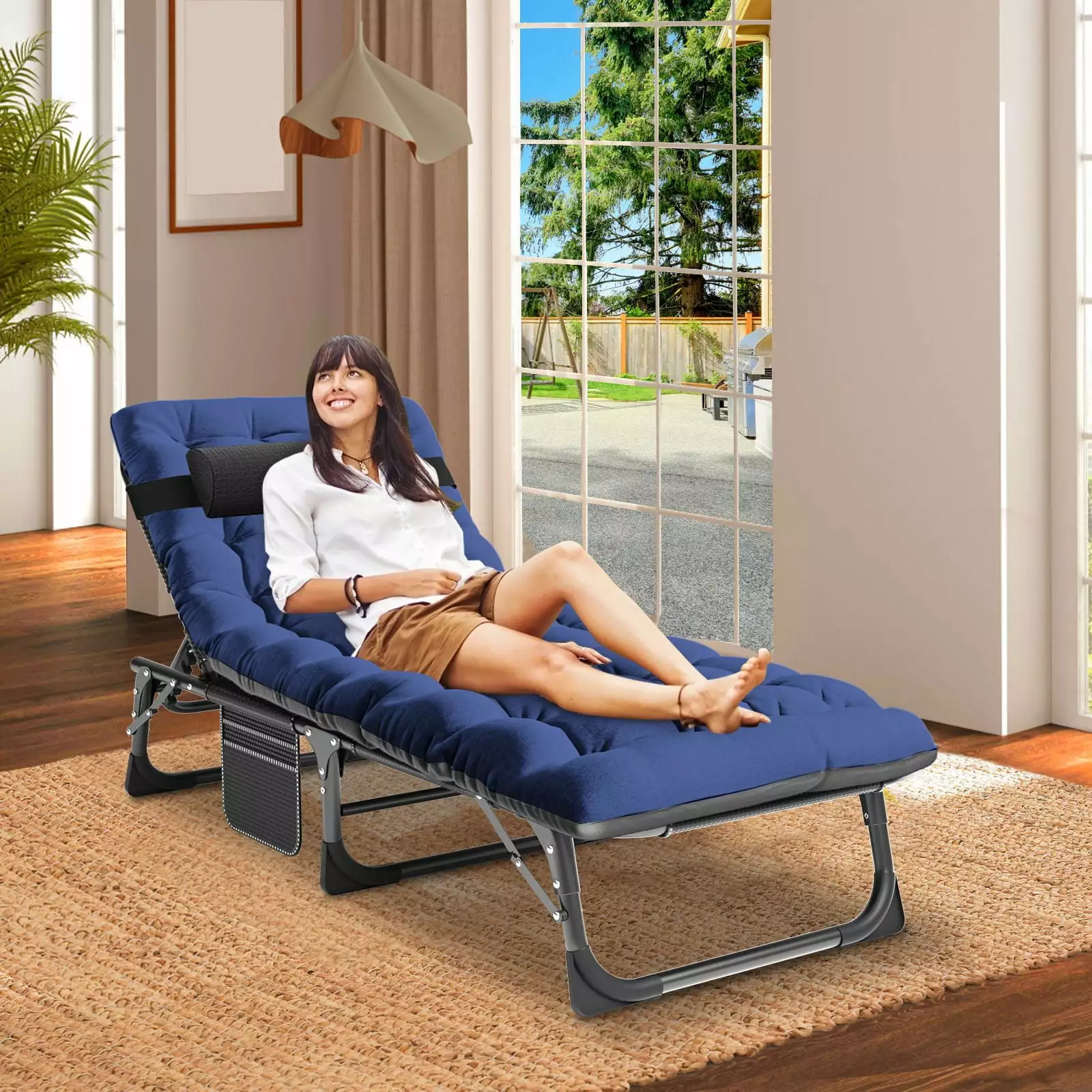 MOPHOTO camping cot. folding bed. adjustable lounge chair with full square tube frame for strong support. Load capacity up to 400 lbs for more stability. When unfolded the chair measures:75.2"x 26.8"x 11". Comes with removable headrest and cotton pad. The beach lounger chair has a side pocket. to place your phone. books or keys. Adjustable lounge chair is designed with 5-position adjustable locking system. which can be adjusted to a comfortable position according to your needs. Portable adjustable folding bed with folded dimensions of 28.3" x 26.8" x 7.1". 5-fold storage design for easy transportation and storage. Perfect for relaxing and lounging at home. pool. lake. RV. campground. patio. deck. tent or cabin; you can sit up. lie down or lie flat; can also be used as a folding bed in the office or at home; and can also be used as a temporary bed for guests when they visit.