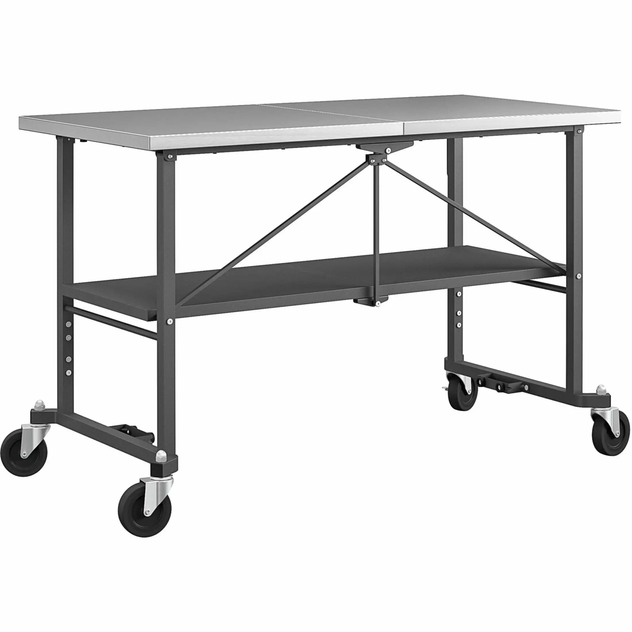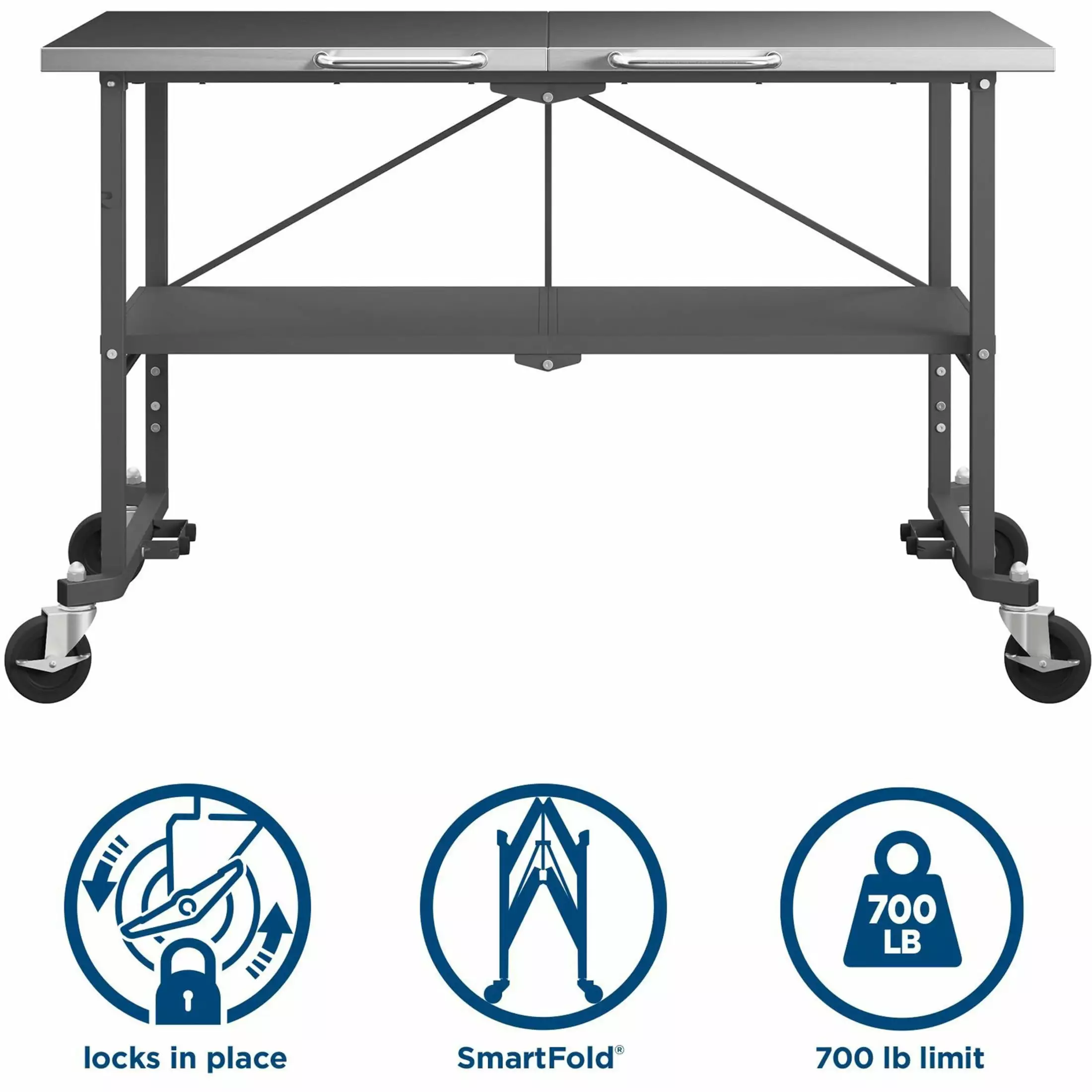 Take the Commercial SmartFold Portable Workbench anywhere the work is! When your work is done. simply fold and store away. The food-grade type 304 Stainless Steel top shelf and industrial-strength steel frame allows this utility table to handle a wide variety of jobs. It can handle a weight capacity of 400 pounds on the Stainless Steel top shelf and 300 pounds on the bottom shelf. The two locking casters allow you to easily transport and keep it in place while you work. The innovative folding design allows you to store away in seconds. saving you time and storage space. Life is a story: a collection of moments. told one memory at a time. shared with people we love. And for over 80 years. COSCO has been proud to be part of that story. offering products that improve and simplify your everyday life. Whether you are moving. painting. redecorating. hosting guests. or simply relaxing outdoors. we have you covered. As life unfolds. we will continue to deliver products with practical and innovative designs. It’s our promise to you. COSCO. Smart. By Design.