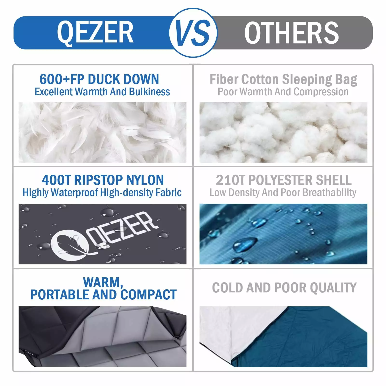- ?? SATISFACTION GUARANTEE ??QEZER always provides our customers with the best sleeping bag products and services with premium down. If you have any product questions. please contact us. we will respond sincerely and do our best to keep you satisfied.