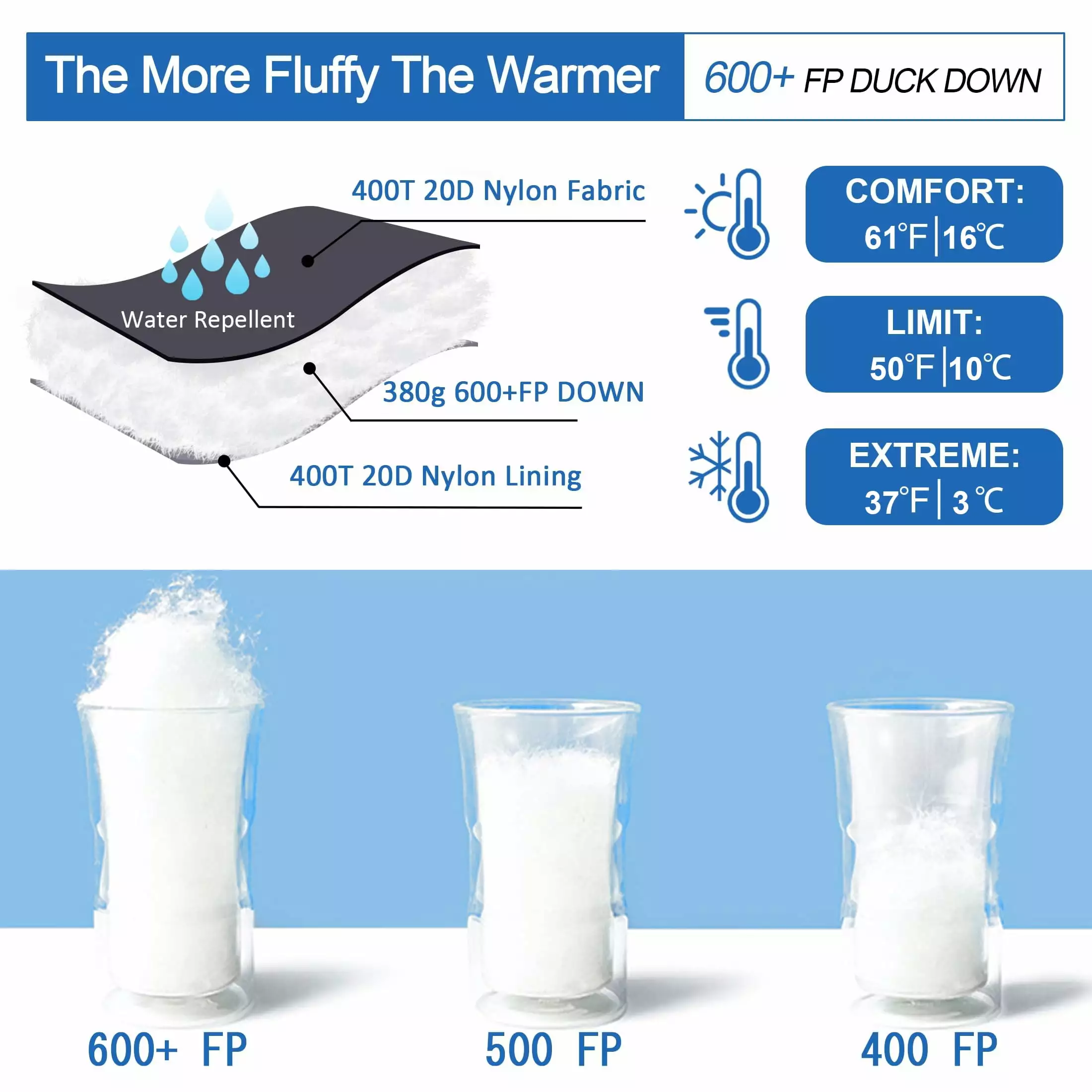 - ??KEEP WARM??Filled with 380g 600+ Fill Power selected premium duck down. the down sleeping bag keeps you stay in warm and dry. Pure natural and healthy material. fluffy and soft. no odor or impurities. Comfort temperature: 50??F-61??F(10??C ~ 16??C). Double zipper and windproof strip design prevent cold air from entering. Mummy sleeping bag head shape fits the head better and keeps warm. the lower body is rectangular. you can move foots freely.