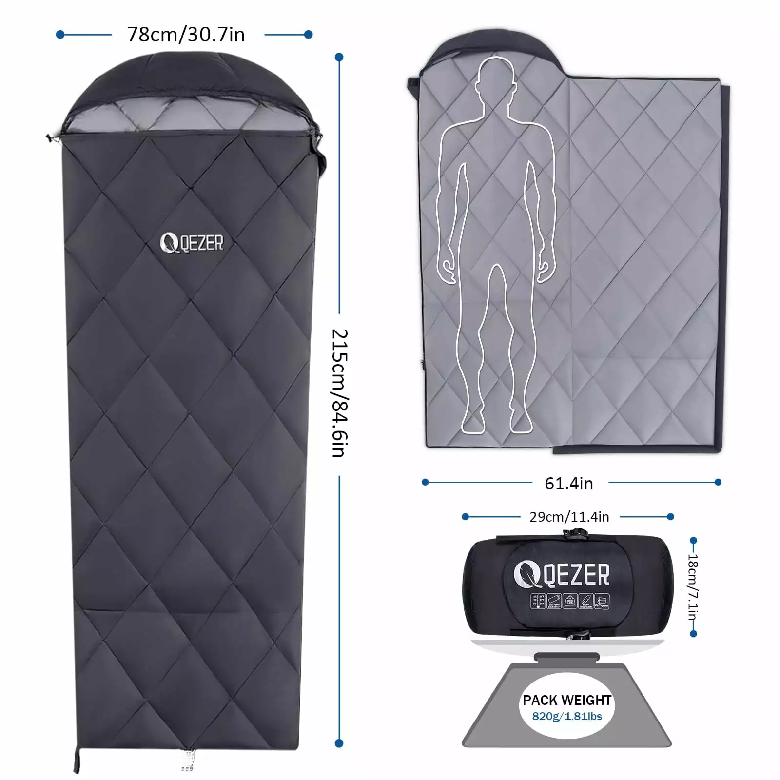 Introducing the QEZER Ultralight Sleeping Bag: Weighing just 1.81lbs and compacted into a package size of 11.4" x 7.1". it’s half the weight and volume of polyester bags. making it ideal for space-saving adventures. Filled with 380g 600+ Fill Power premium duck down. it ensures warmth and dryness with its pure. natural material. Comfortable in temperatures from 50°F-61°F. its double zipper and windproof strip design keep cold air out. Measuring 30.7"x84.6". it’s spacious. with a foot zipper for ventilation. Crafted with 400T 20D high-density nylon fabric. it’s moisture. tear. and drill-resistant. Trust QEZER for top-quality products and customer service.