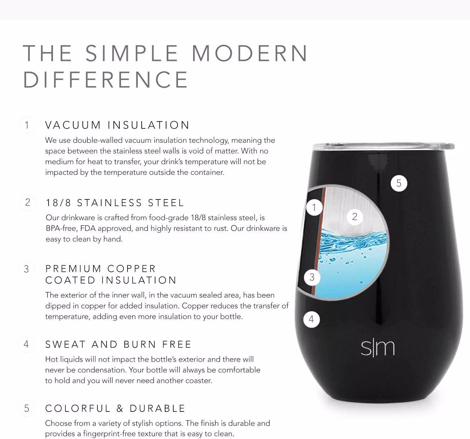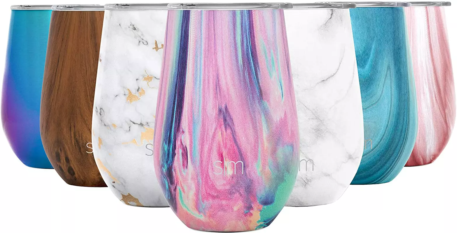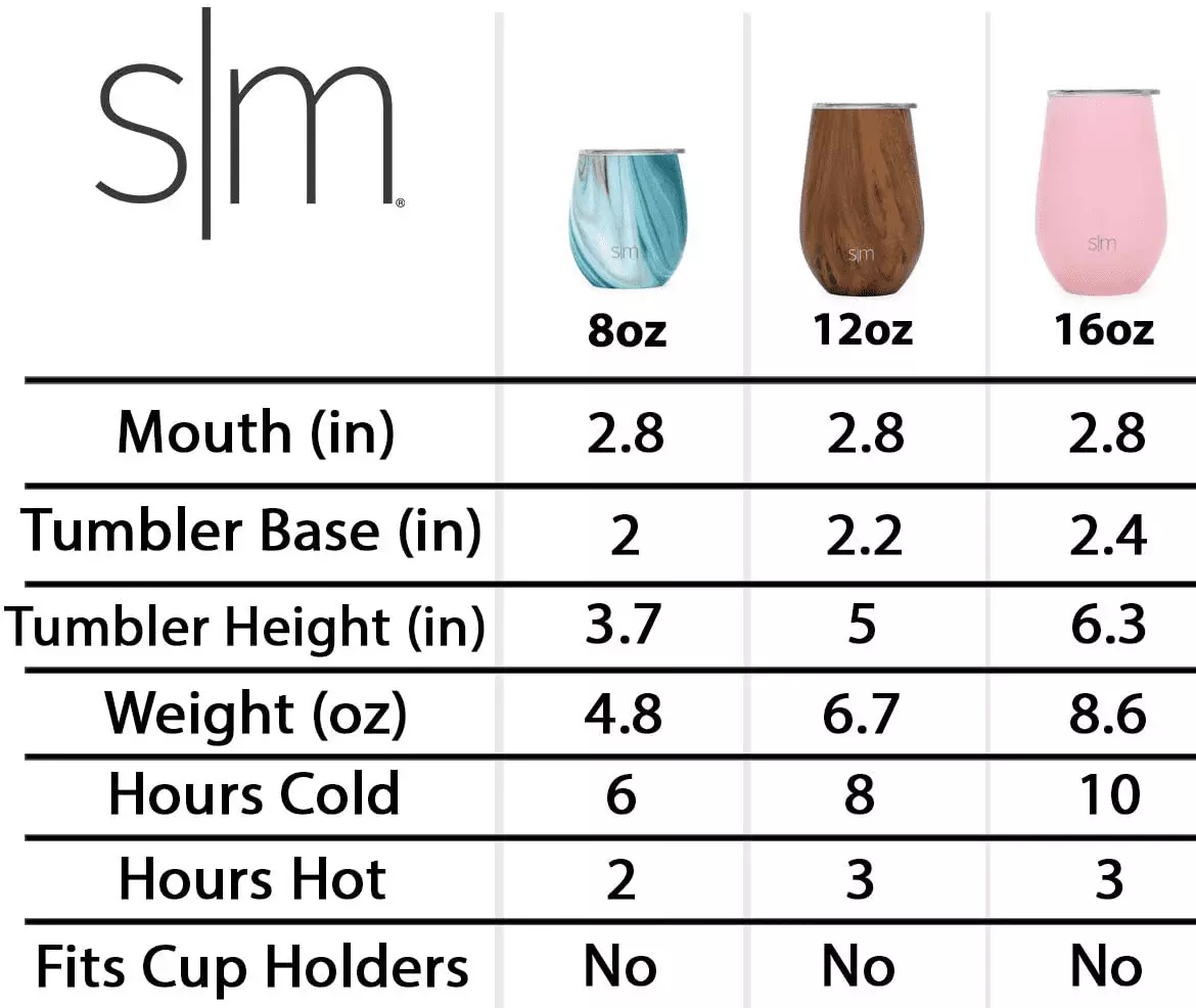 The Simple Modern Spirit Wine Tumbler is made from double walled. vacuum insulated stainless steel. keeping your wine or cocktail cold for hours. The cup comes with a clear. plastic. press-in lid.