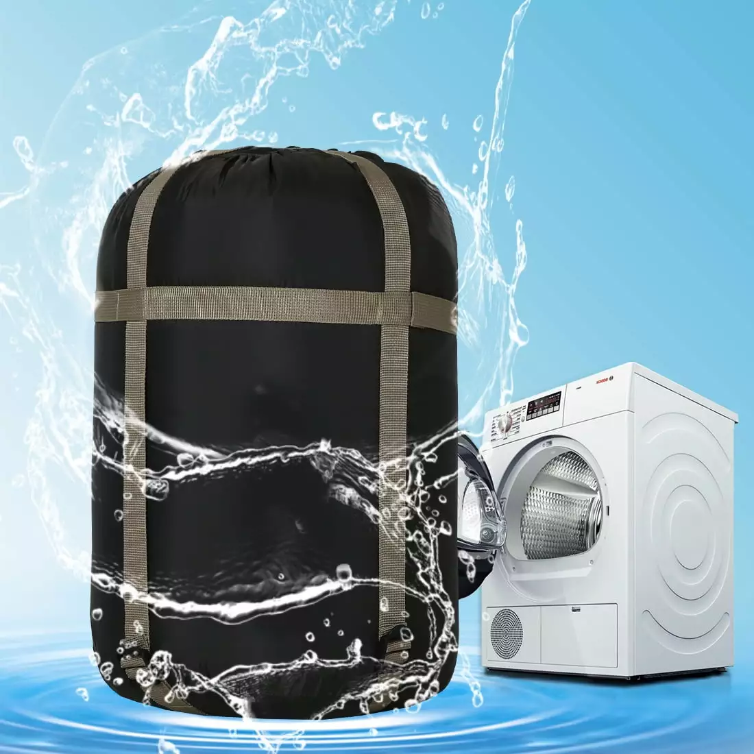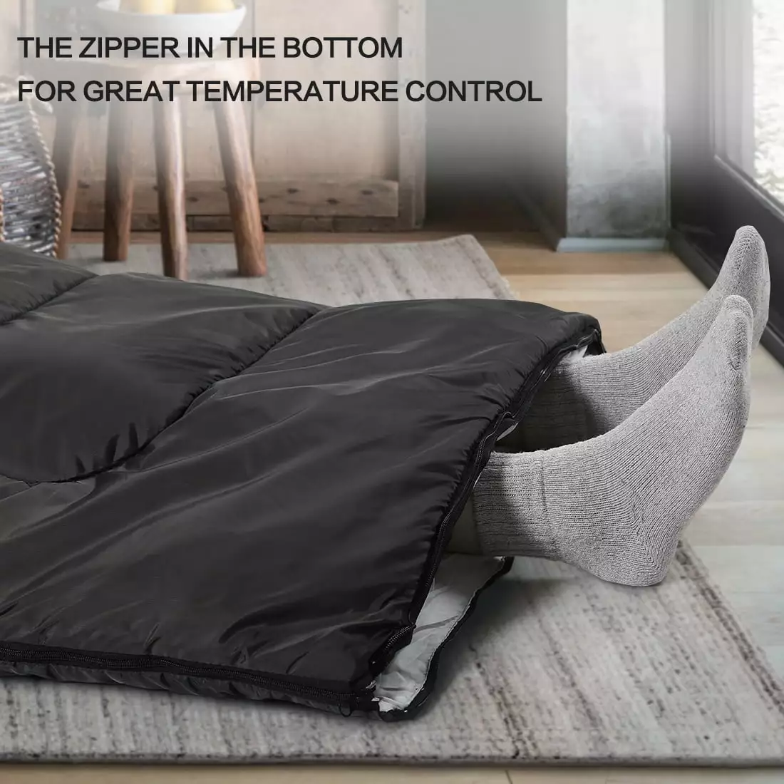 Enough room to roll over. let your body not tight but relaxed. The windbreak at the collar with drawstring inside and a hood to cover head. face and ears to keep your head warm. You won’t be shivering for the loss of heat. but feel cozy. Humanized designed. not just a sleeping bag. comfy to just wear while chilling. watching tv. For warmer nights. the sleeping bag can unzip into a blanket. For colder nights. the sleeping bag can be zipped up completely and use the head pocket. Machine washable. wash on cold and tumble dry on low. Expose to the sun to make the sleeping bag more fluffy. Equiped with a compression sack. portable to store and carry.