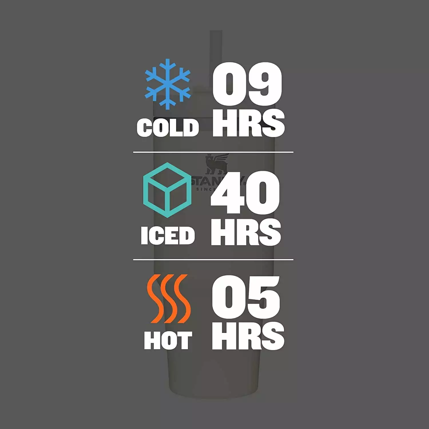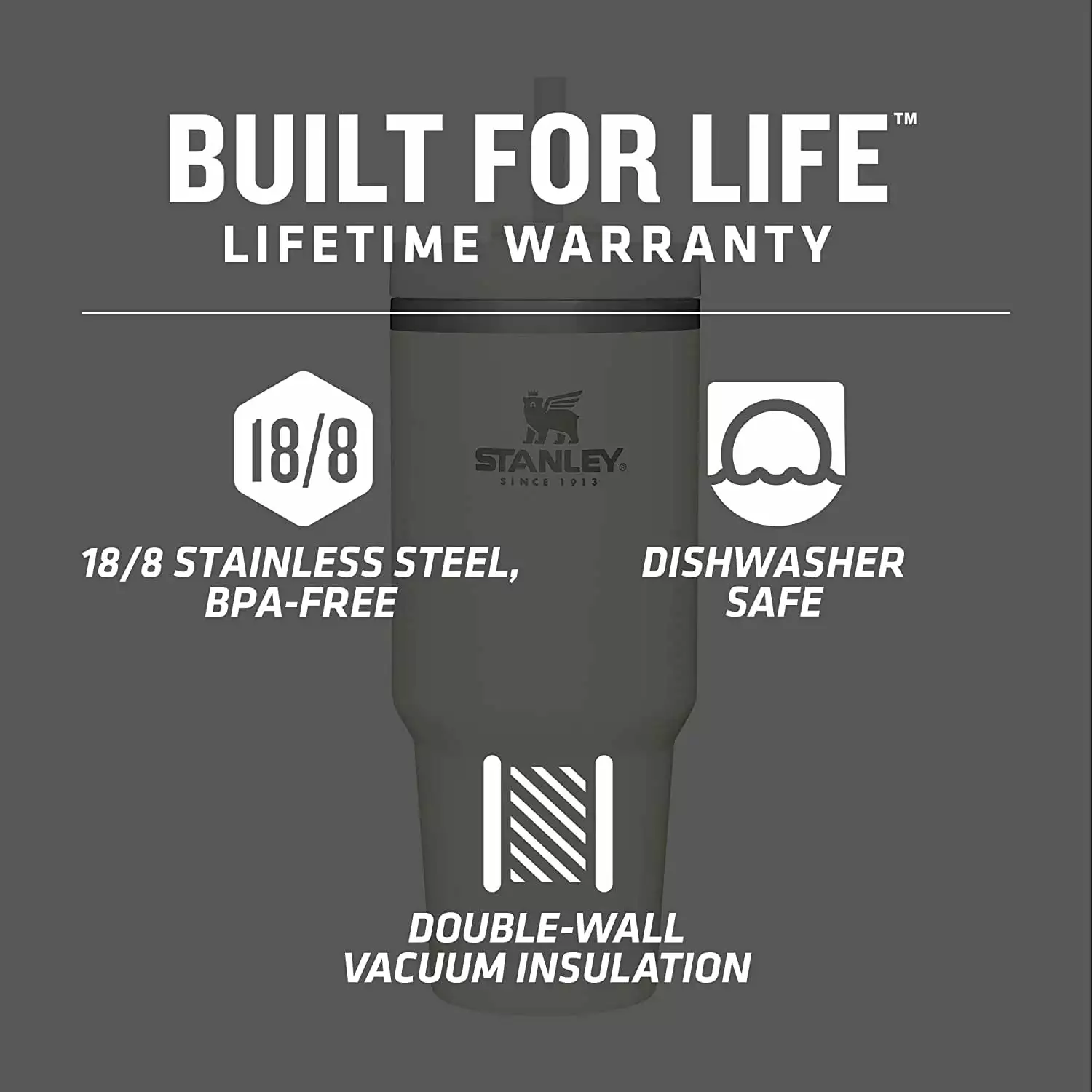 Constructed of recycled stainless steel for sustainable sipping. our 40 oz Quencher H2.0 offers maximum hydration with fewer refills. Commuting. studio workouts. day trips or your front porch?you?ll want this tumbler by your side. Thanks to STANLEY?s vacuum insulation. your water will stay ice-cold. hour after hour. The advanced FlowState lid features a rotating cover with three positions: a straw opening designed to resist splashes while holding the reusable straw in place. a drink opening. and a full-cover top. The ergonomic handle includes comfort-grip inserts for easy carrying. and the narrow base fits just about any car cup holder.