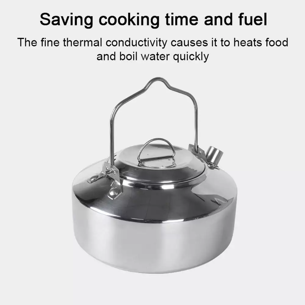 Outdoor Stainless Steel Kettle Locking Handle Camping Hung Pot Portable Coffee Pot Picnic Cooker 1L Teapot Cooking Accessory bottom is wide. height is low. and it is not easy to overturn in camping or wild. so it can be used stably. Small and compact enough to store in travel bag for storage and carry. handle can be locked. and it can stand on its own without tipping. When heating. handle can stand on its own to prevents scalding. 4mm thick handle is comfortable to use. kettle is made of fine quality stainless steel that can withstand high temperatures and has a high resistance to corrosion. fine thermal conductivity causes it to heats food and boil water quickly. saving cooking time and fuel.