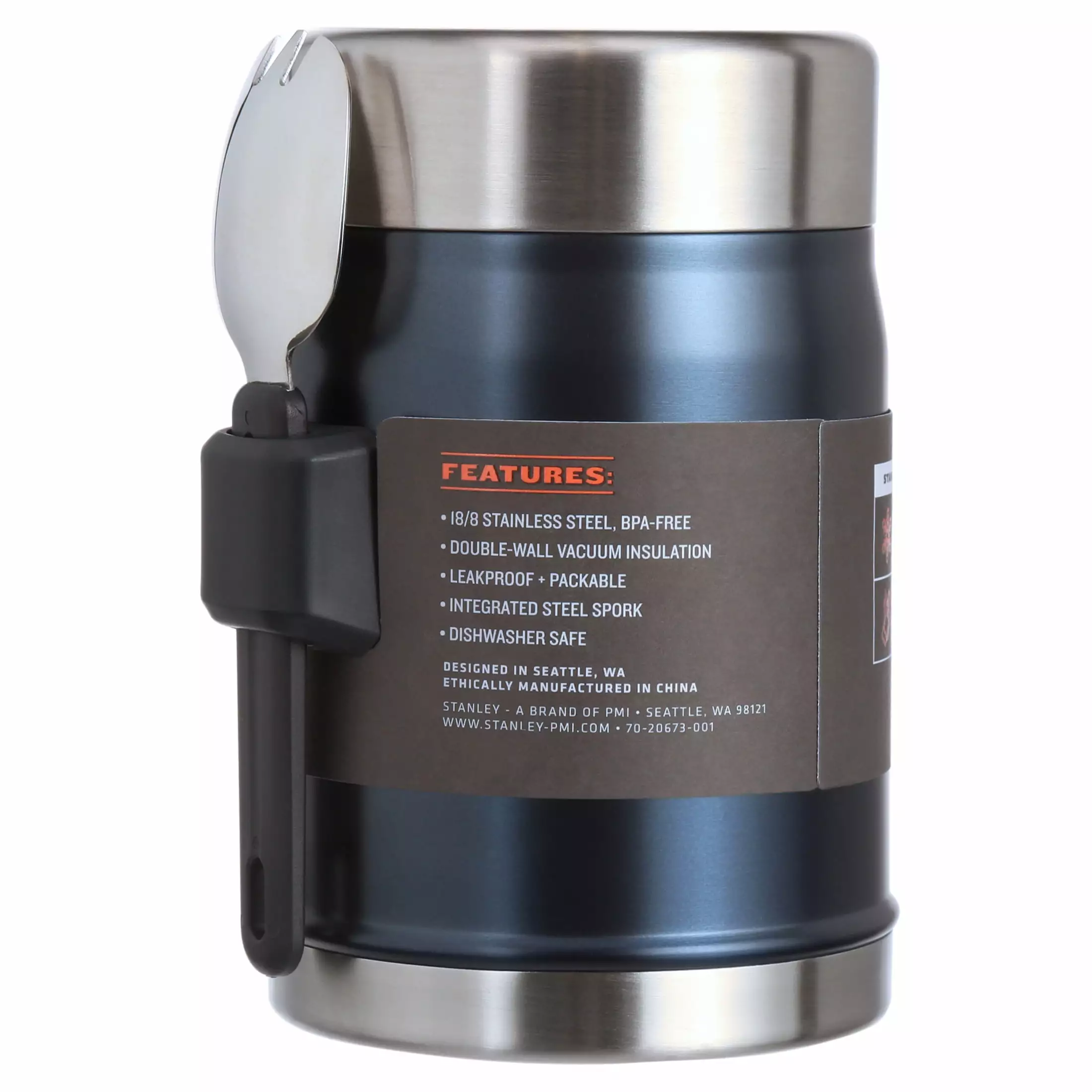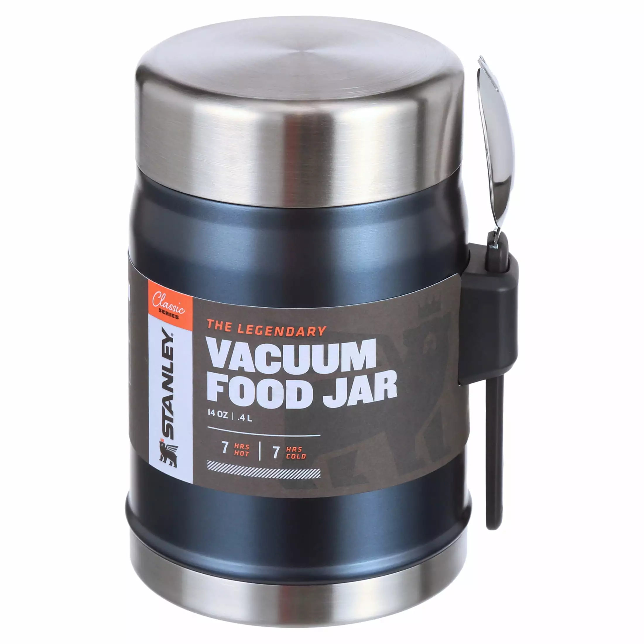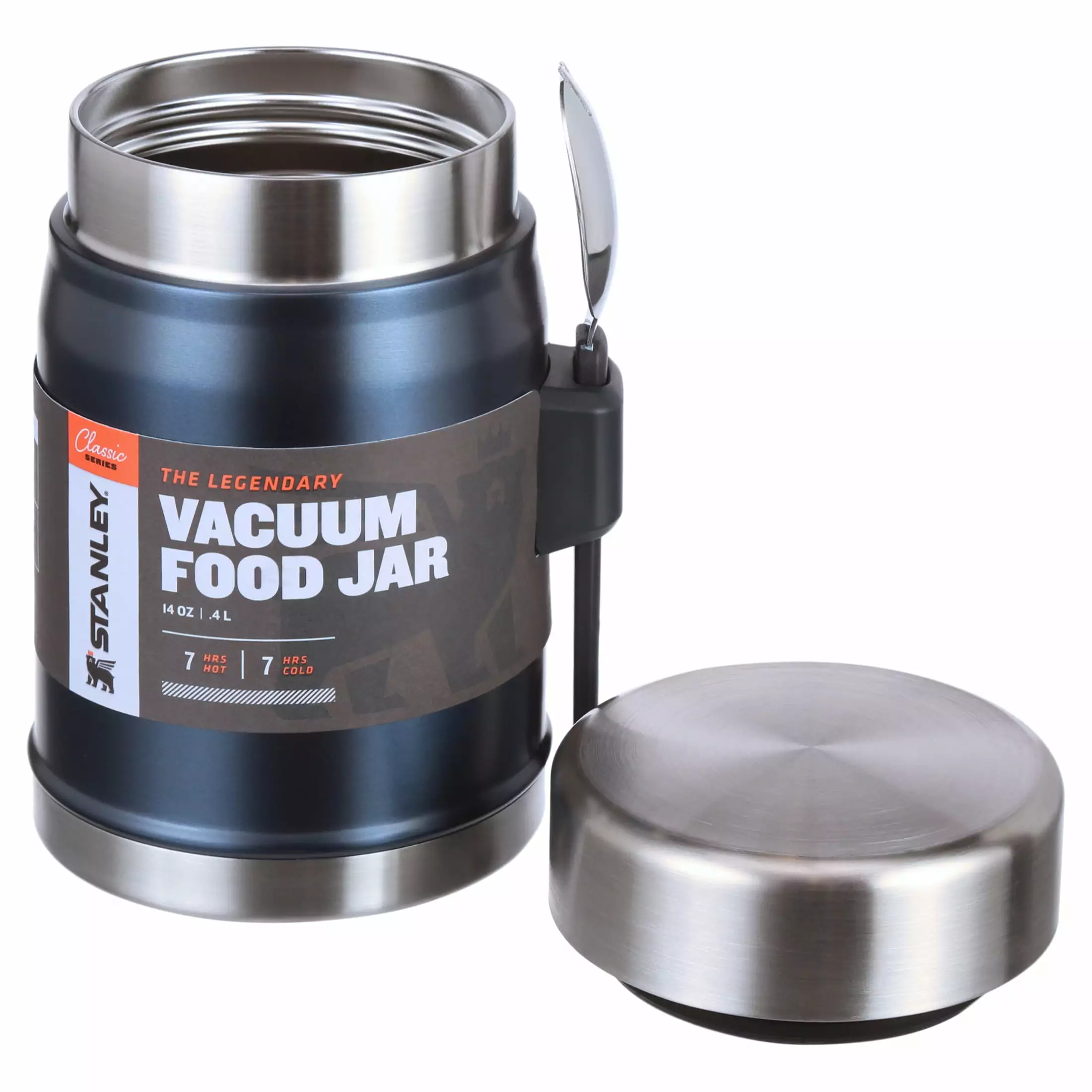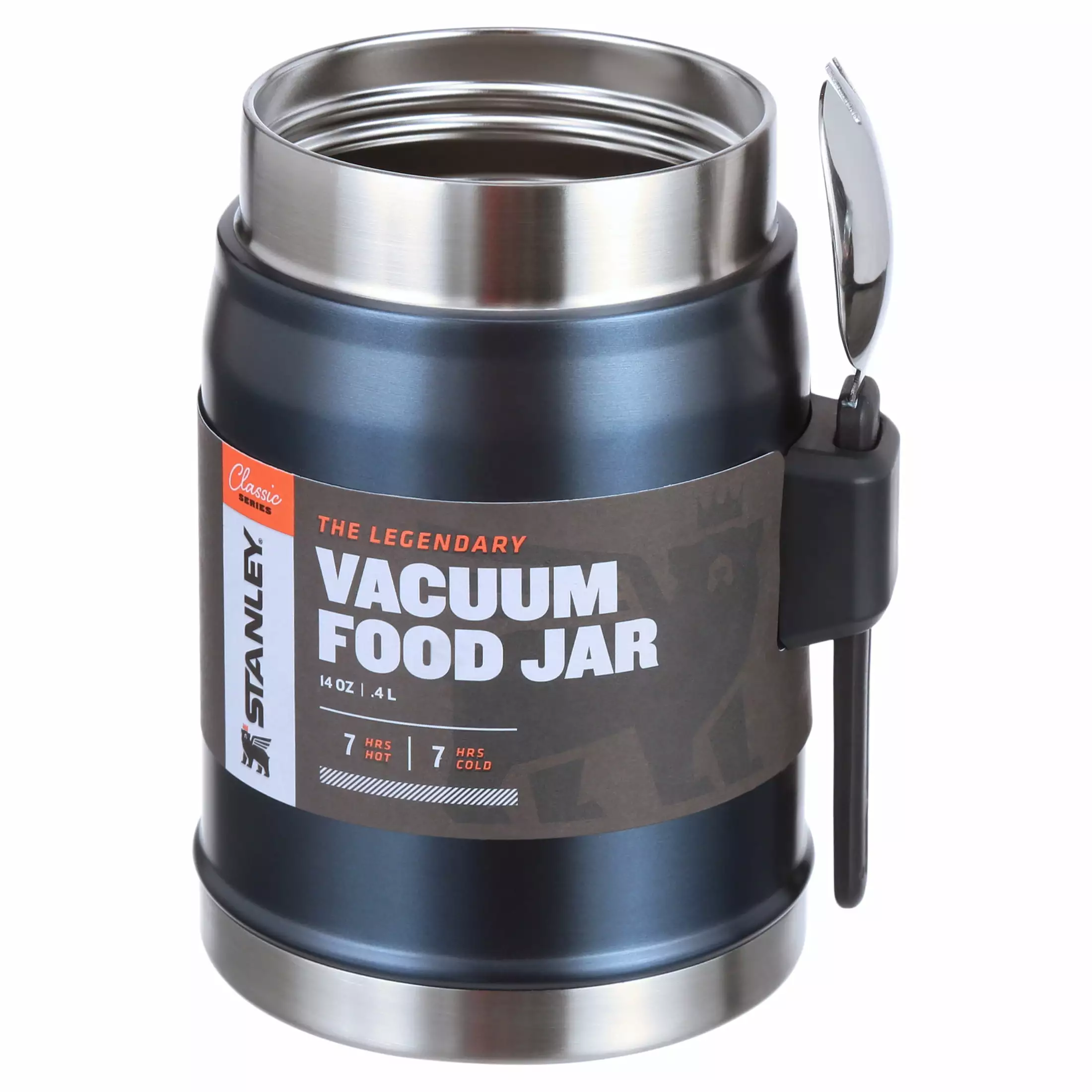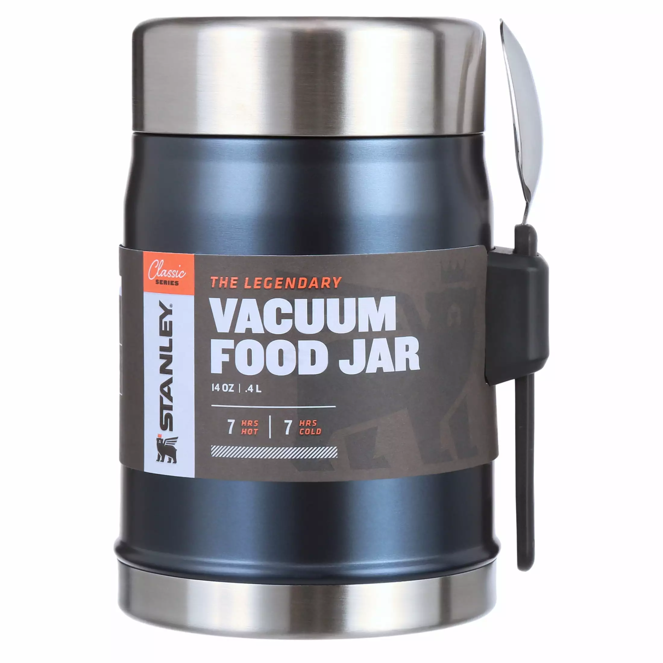 The hottest new place to eat. is wherever you happen to be. This Classic Food Jar is rust-free. completely leak-proof and packable. and keeps food hot or cold for 8 hours. Just toss it in your backpack. trunk.boat. or side saddle and it’s ready when you are with an attached stainless steel spork and wide-mouth lid. And since it’s a Stanley that legendary toughness is built right in.The Legendary Food Jar + Spork 14oz Nightfall