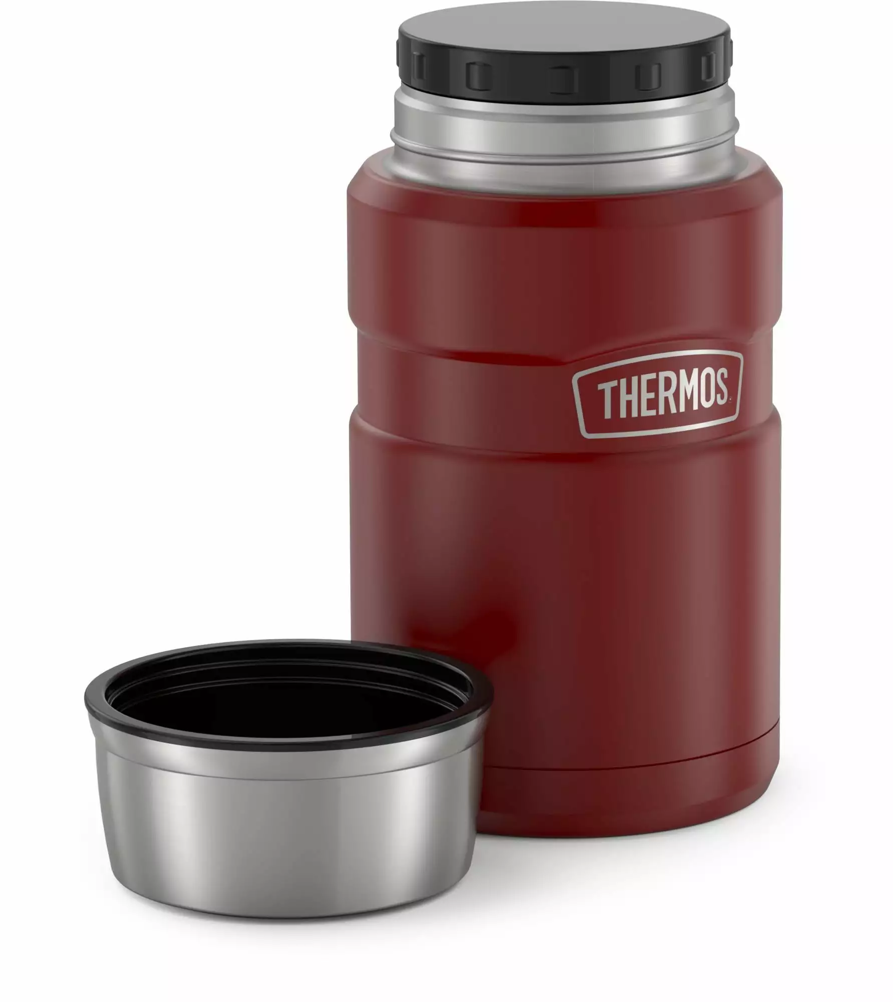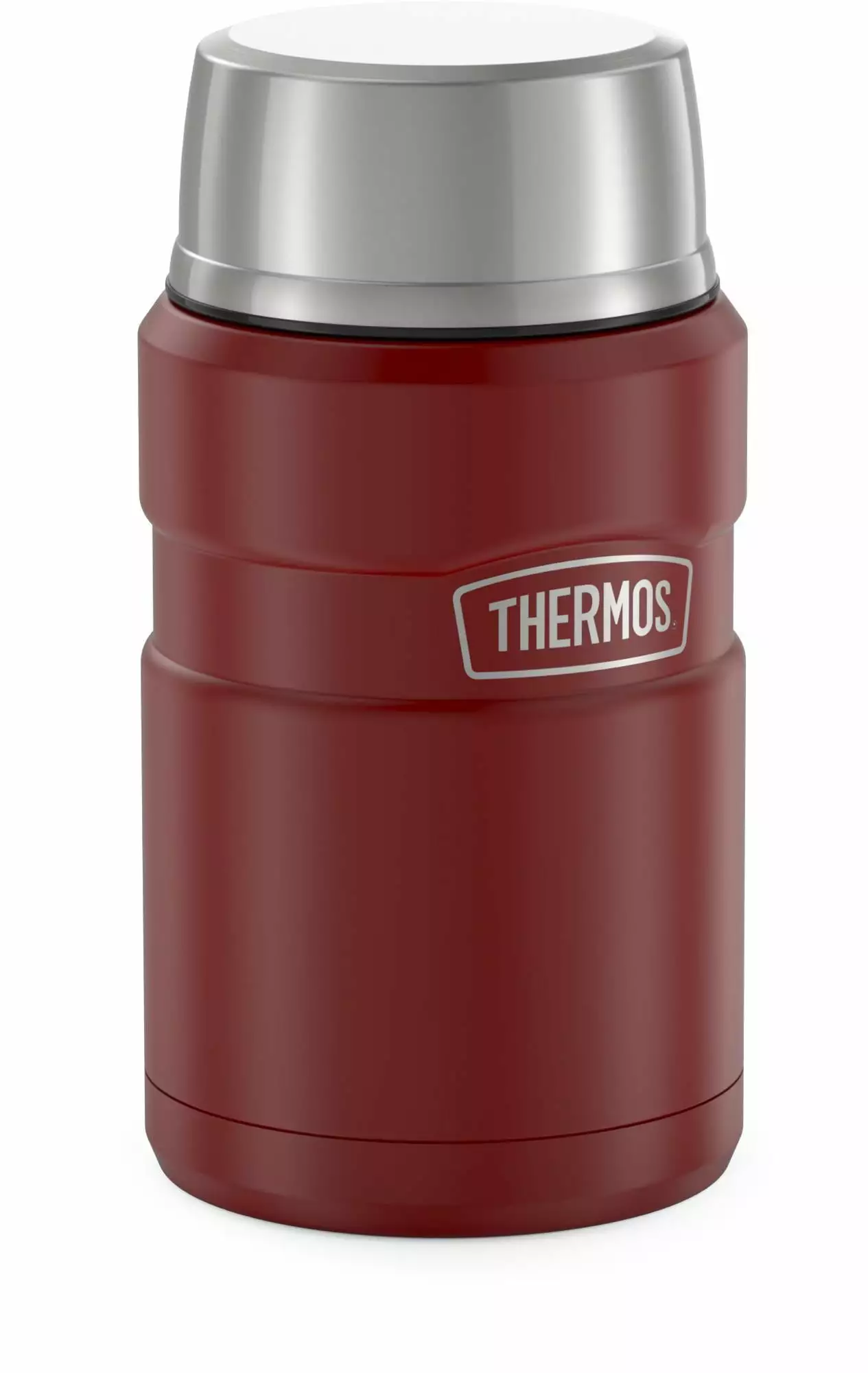 The Thermos Stainless King 24 ounce Stainless Steel Food Jar rules for taking the food you love anywhere. Keep fresh fruit and vegetables cool for up to 14 hours while you take on the day. For your favorite hot soups or oatmeal. every sip stays piping hot for up to 9 hours. Your options are endless. Count on Thermos vacuum insulation to keep the weather out and the delicious in. It’s easy to fill. easy to clean. and comes crowned with a built-in serving bowl lid. Thermos makes high-performance and durable food jars fit for a king or queen. Constructed with double-wall stainless steel. this insulated food jar is durable and designed to have a contoured shape that’s easy to grip.