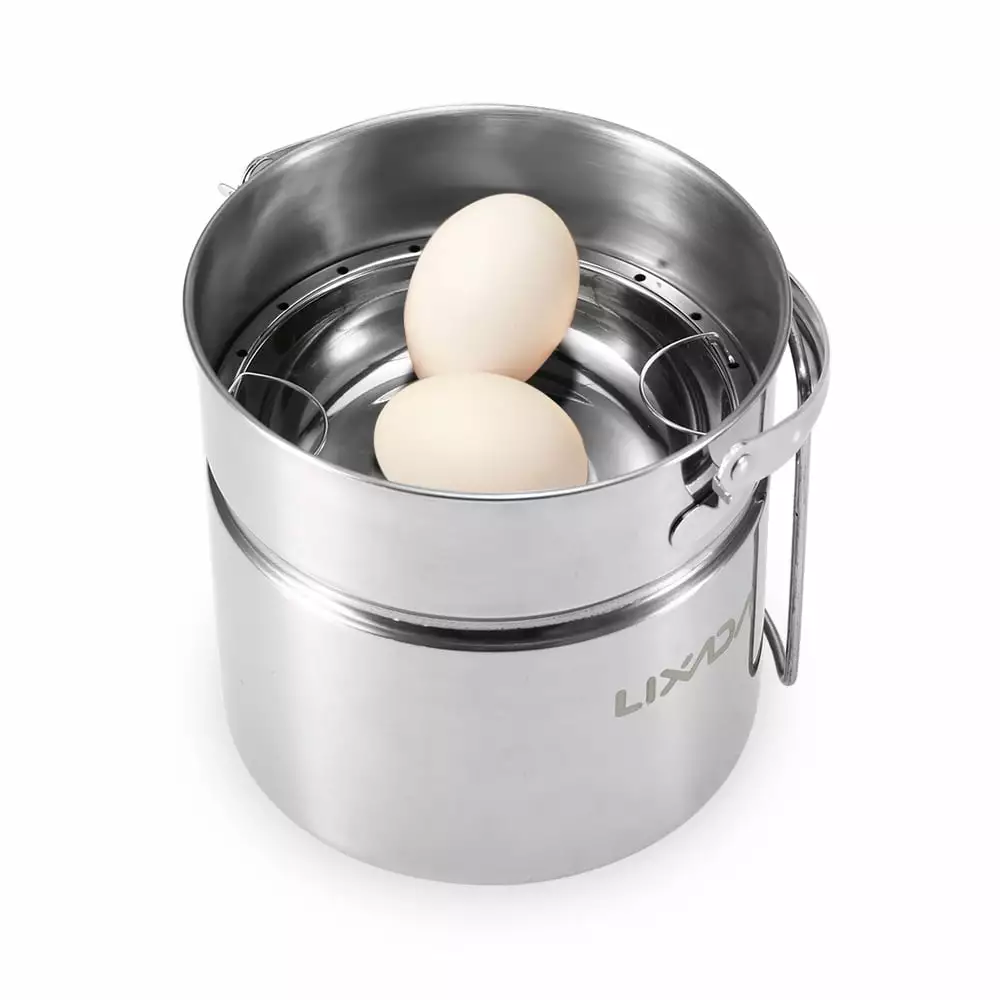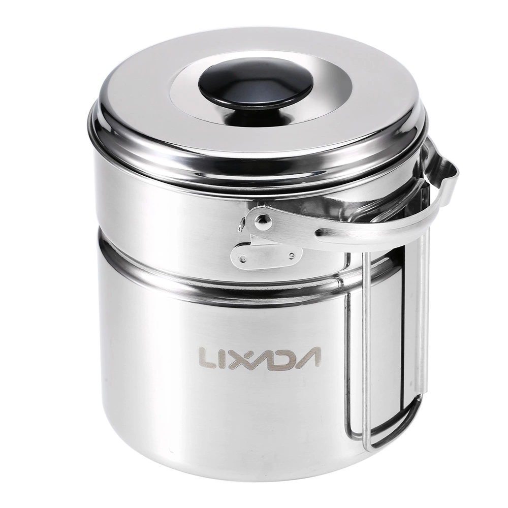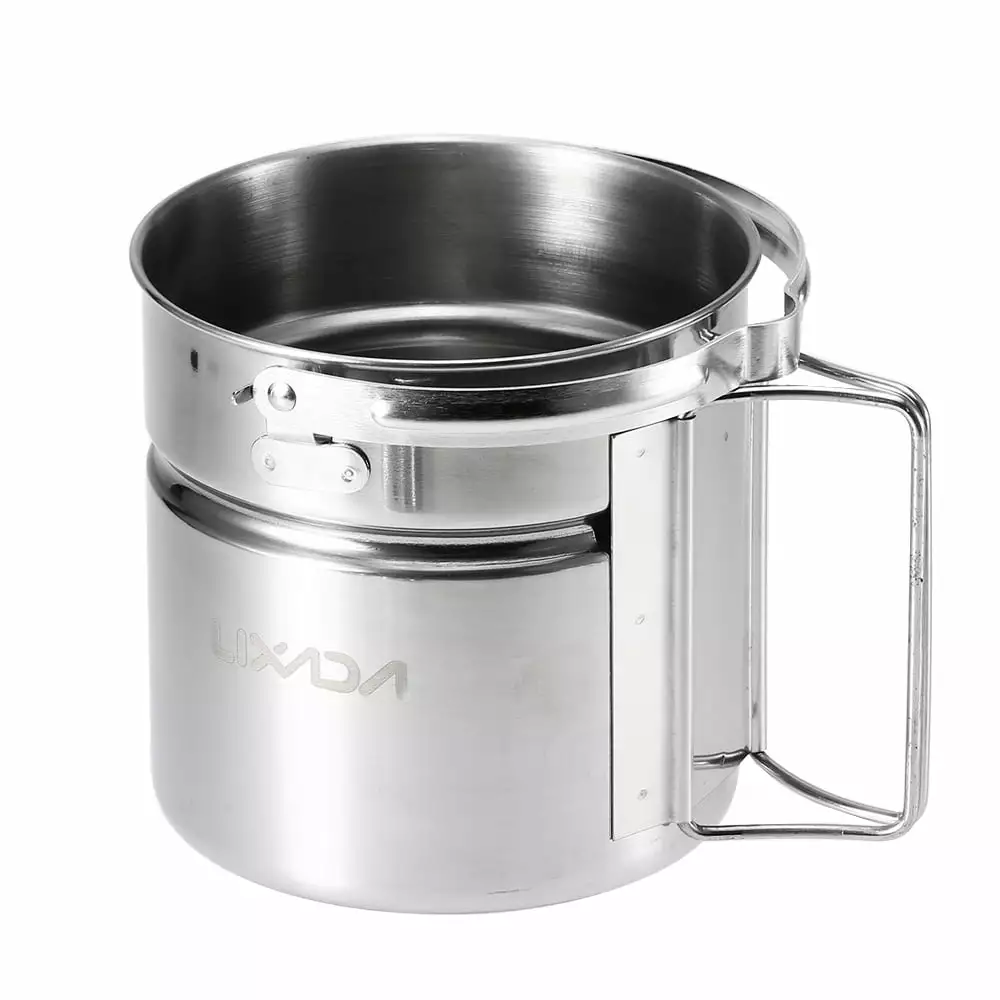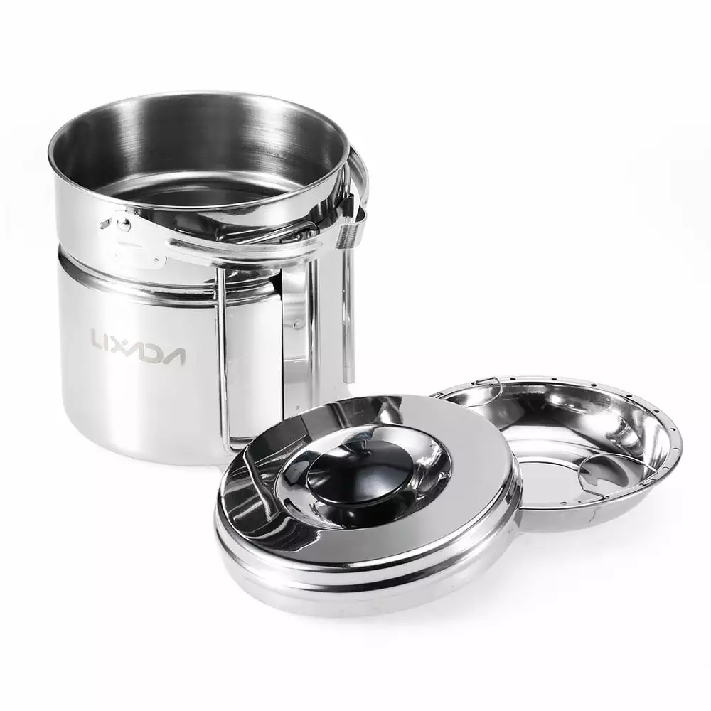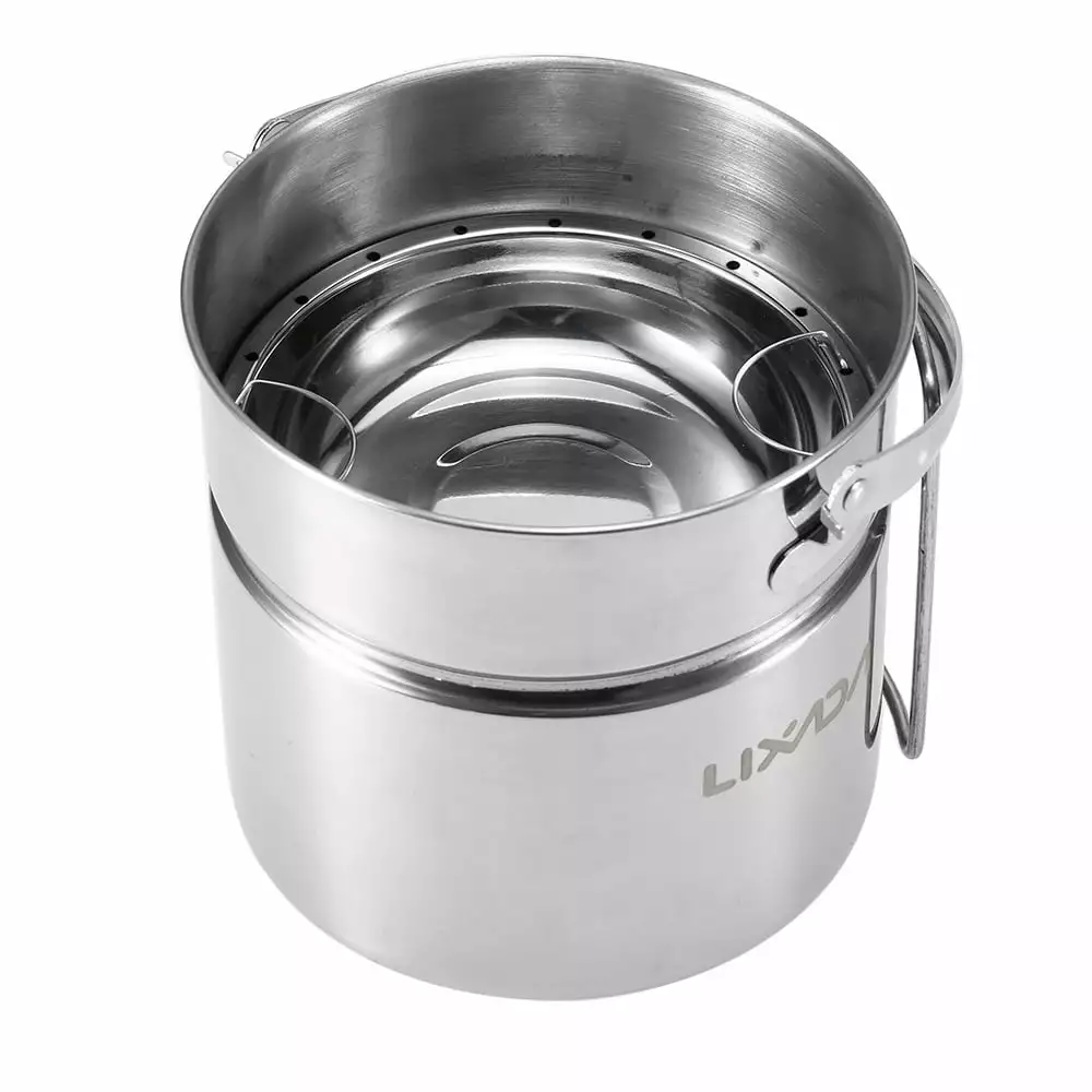 Versatile Stainless Steel Camping Pot with Internal Steaming Dish Foldable Handle. Convenient for Activities