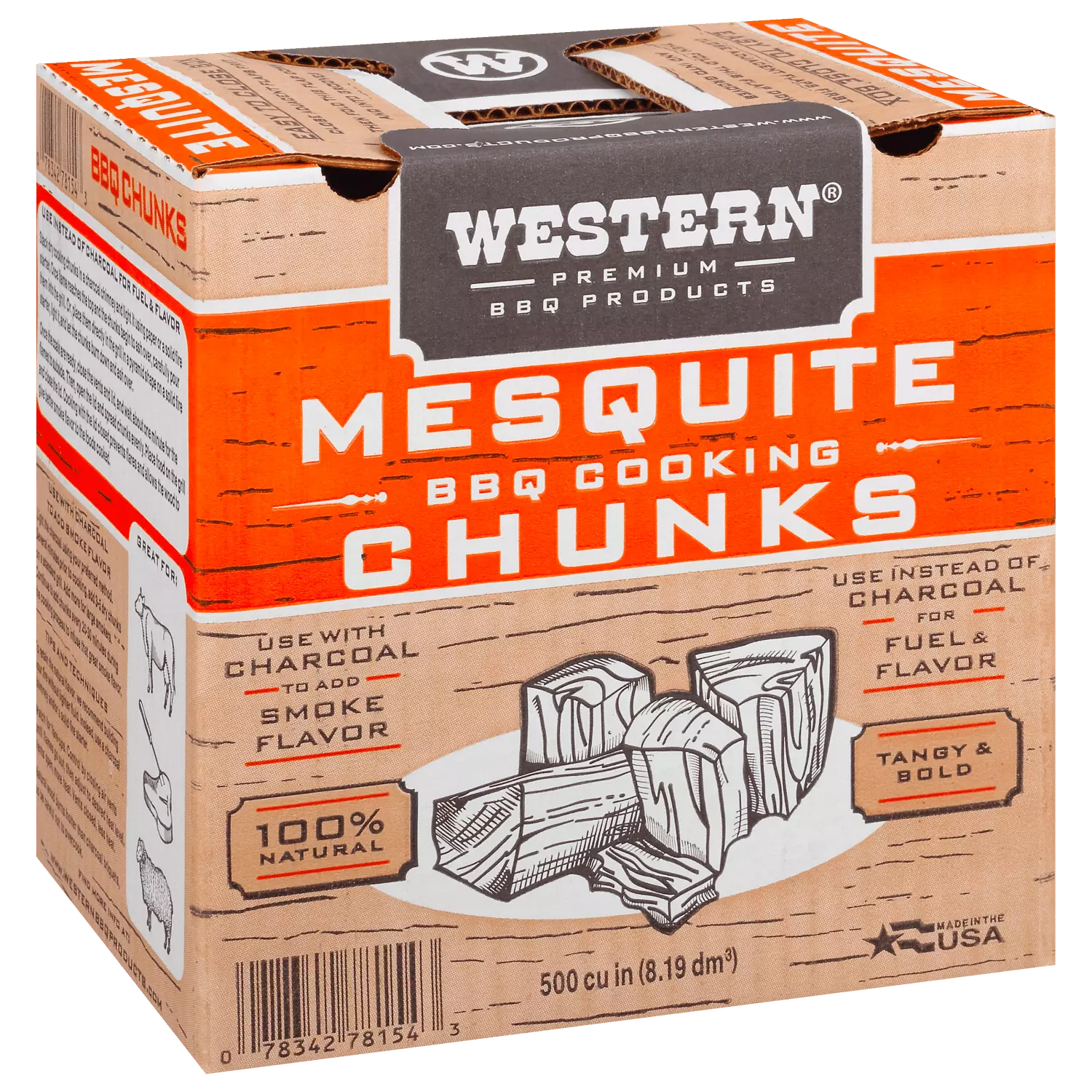 Western Premium BBQ Products Mesquite BBQ cooking wood chunks. 500 CU in (0.289 cubic foot) give a rich. distinct flavor to brisket. steak and other cuts of beef. and they also pair well with other meats such as pork and lamb. Mix Mesquite chunks with a mild flavor like Post Oak to customize your blend and flavor. You can use these wood chunks with or instead of charcoal. with kettle grills. ceramic grills or smokers.