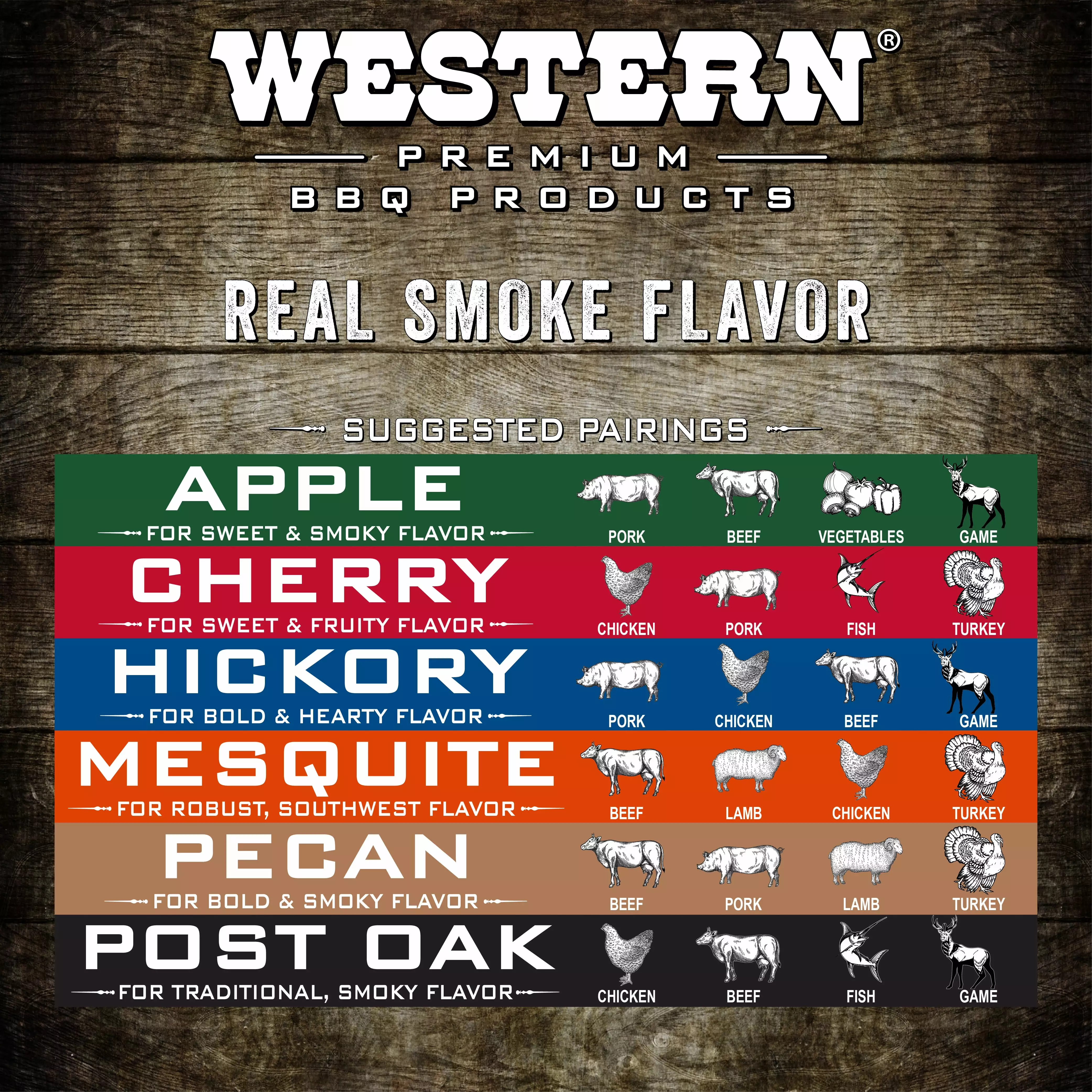Western Premium BBQ Products Pecan BBQ cooking chunks. 500 Cu in (.28 cu ft) Box creates a strong smoke similar to Hickory. but they add a sweeter flavor to meat. Pecan wood smoke pairs well with pork. as well as heavier meats like beef and lamb. For use with lighter foods such as poultry and vegetables. mix Pecan chunks with Apple BBQ cooking chunks.