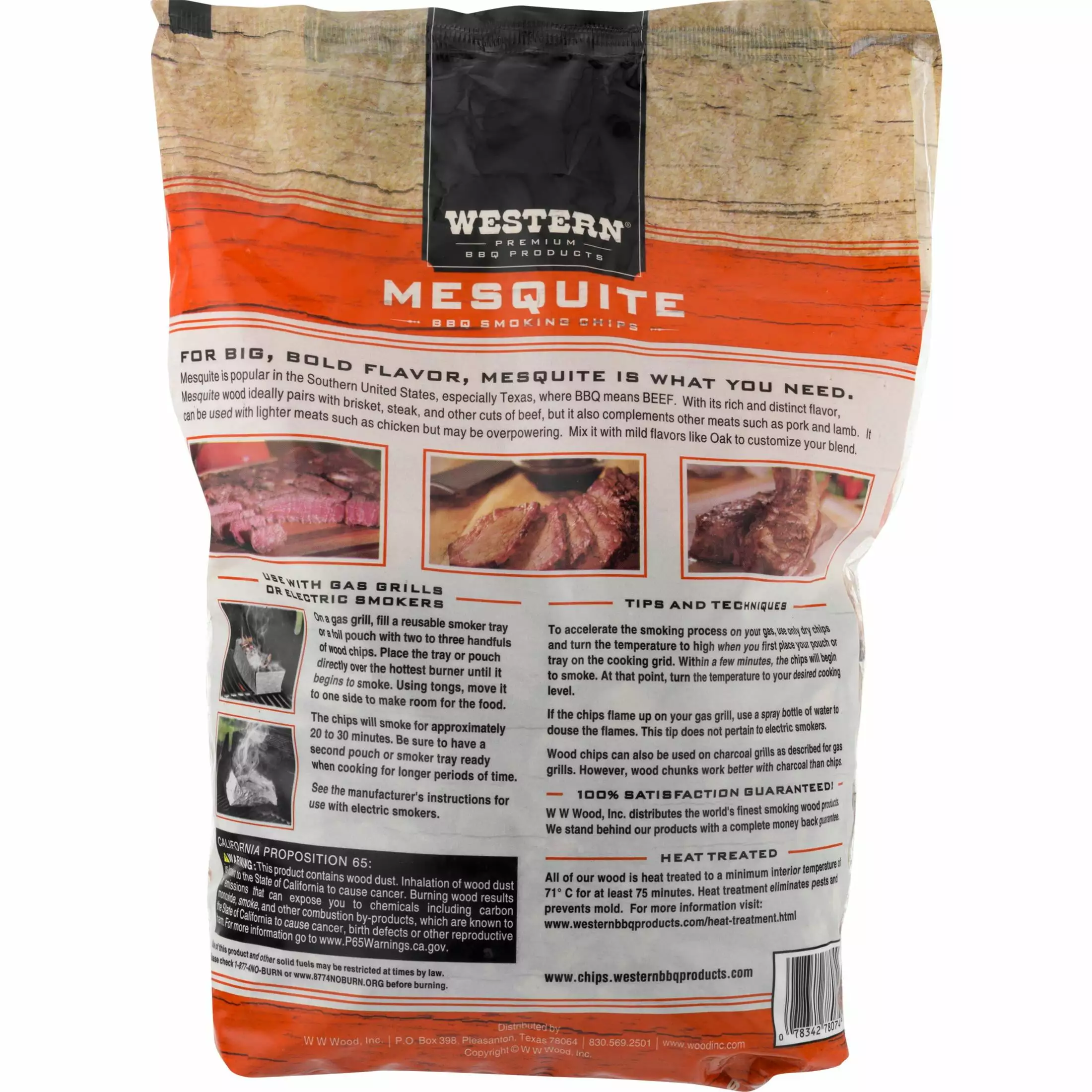 Our mesquite chips pack flavor. big flavor. Our premium wood smoking chips deliver a sweet yet mild flavor to smoked meats that’s sure to delight the family. Try Western Premium BBQ Products Mesquite BBQ Smoking Chips with these American favorites: Beef Sirloins and Filets. Hamburgers. Salmon or Trout. Whole Chicken. BBQ Smoked Wings. Braised Brisket .Baby Back or Spare Ribs and Pork Loin.