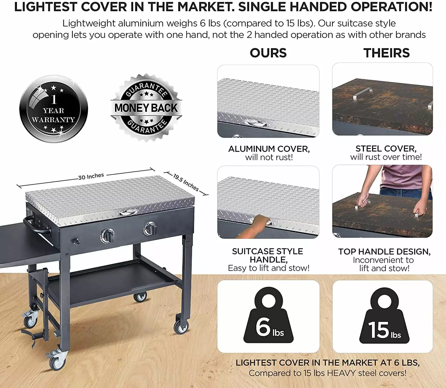 - LIGHTWEIGHT. 2-FINGER LIFT! Lightest weighing aluminum griddle cover in the market at 6 lbs compared with 15 lbs of other brands. Lift your cover with just 2 fingers!
