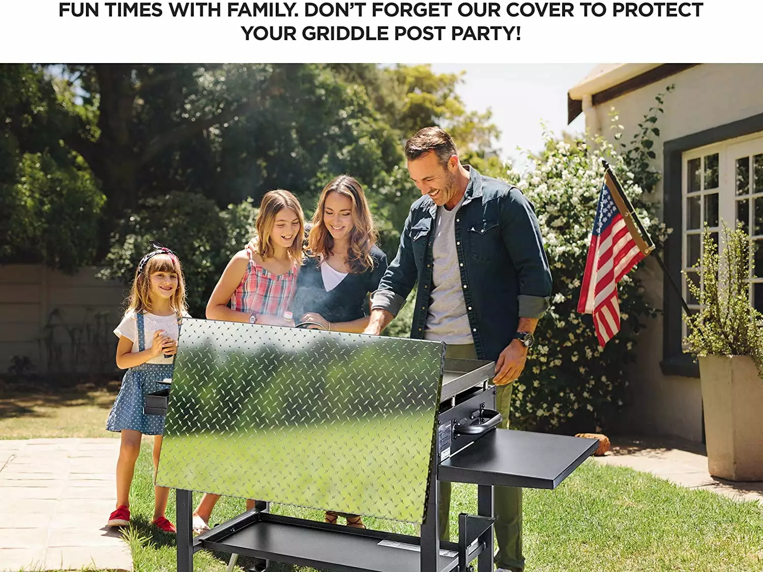 - SUITCASE-STYLE HANDLE. HANGERS TO STOW Easy to lift and stow away your cover with a SUITCASE STYLE HANDLE. you needn’t move around your griddle to lift it. Use the two LONG HANGERS to hang your metal cover on the back of your griddle. Works as a wind deflector while you cook. Designed to fit your griddle cooktop with both side grease and rear grease discharge.