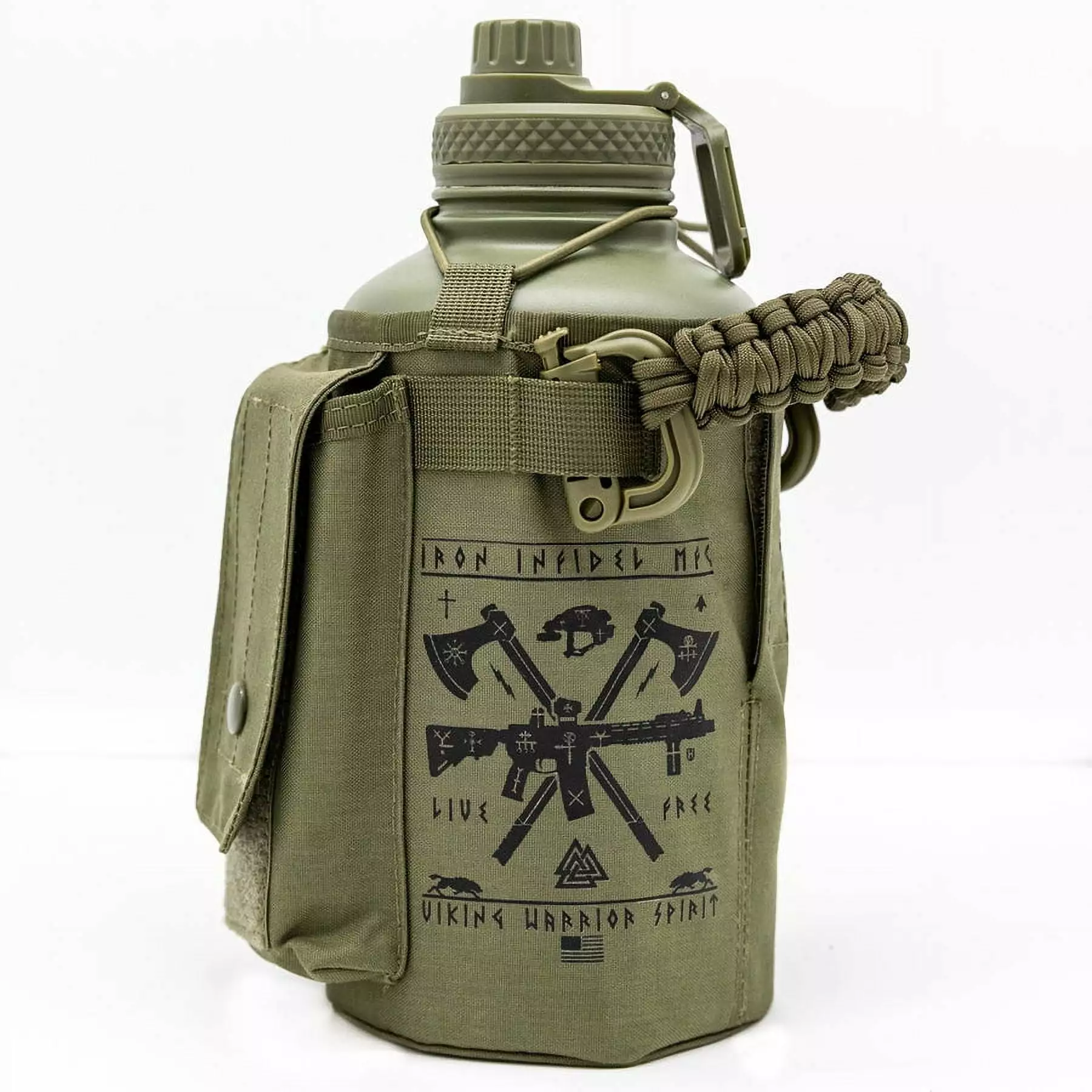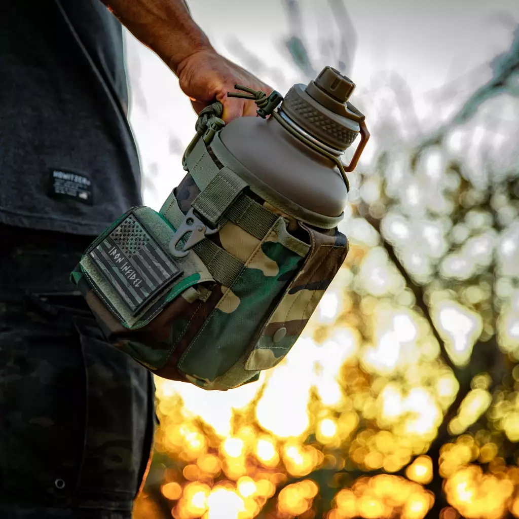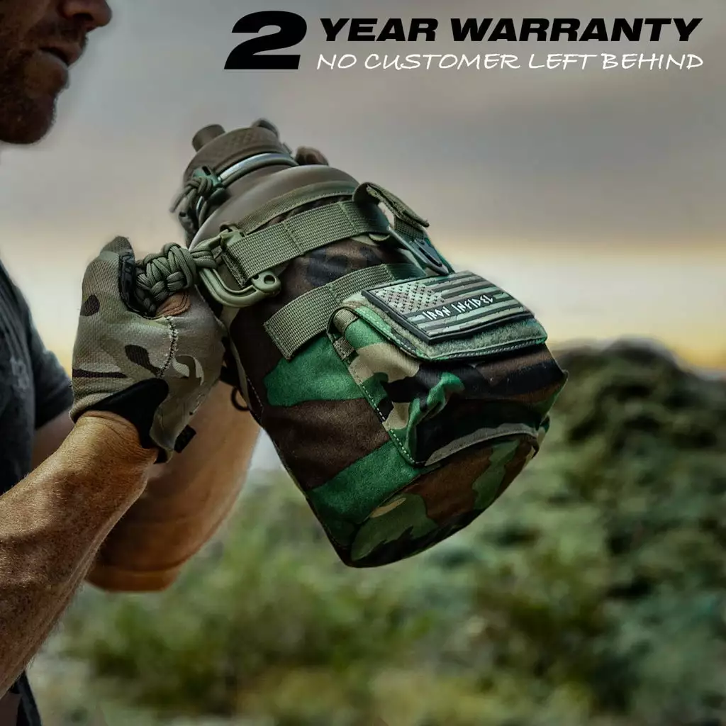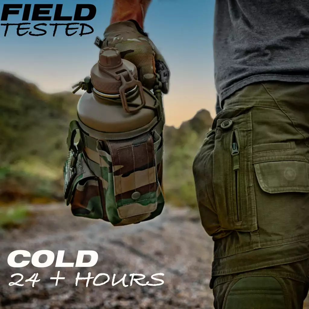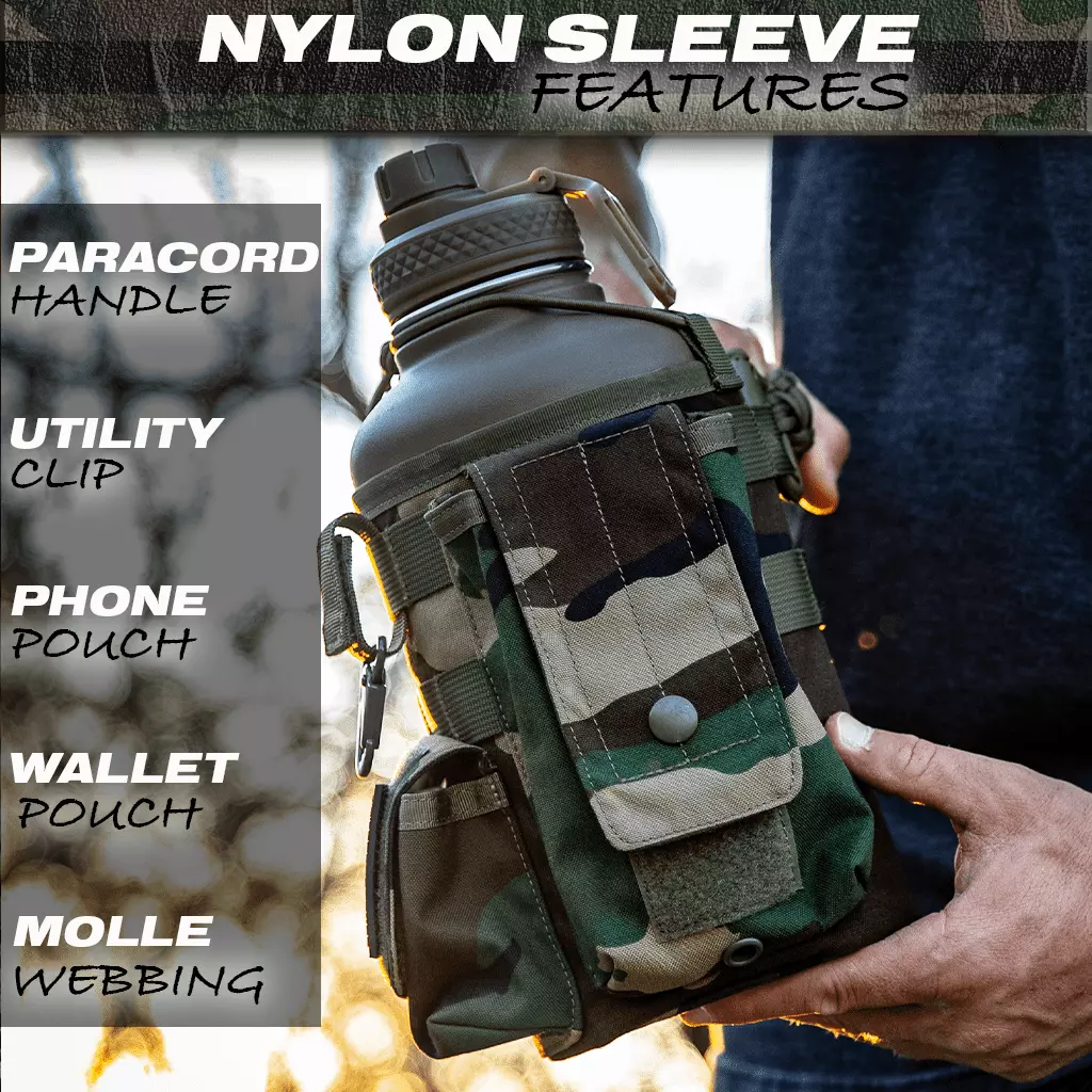The Battle Bottle is the perfect tool to take with you to the outdoors. the gym. or the job site. Made from high quality double-wall stainless steel. all of your liquids will be kept cold for 24+ hours. The military grade nylon sleeve is rip and tear resistant. easily removable and washable. and comes with molle webbing to attach any accessories. Military style magazine pouch and utility pouch for your wallet. phone. keys. or any of your gear and equipment. The 64oz Battle Bottle is made from high-quality. double-wall stainless steel and comes with a rugged removable sleeve.