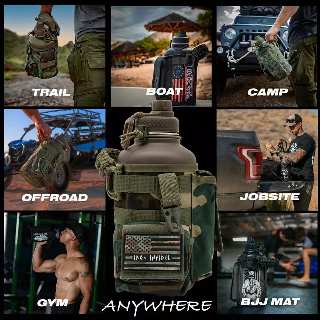 - REMOVABLE COVER – Made from military grade rip and tear resistant fabrics. The nylon cover is removable. washable. and has two utility pouches for your cellphone. wallet. keys. and other belongings. and a removable paracord carry handle. Covers can be interchanged between all Iron Infidel 2 liter bottles