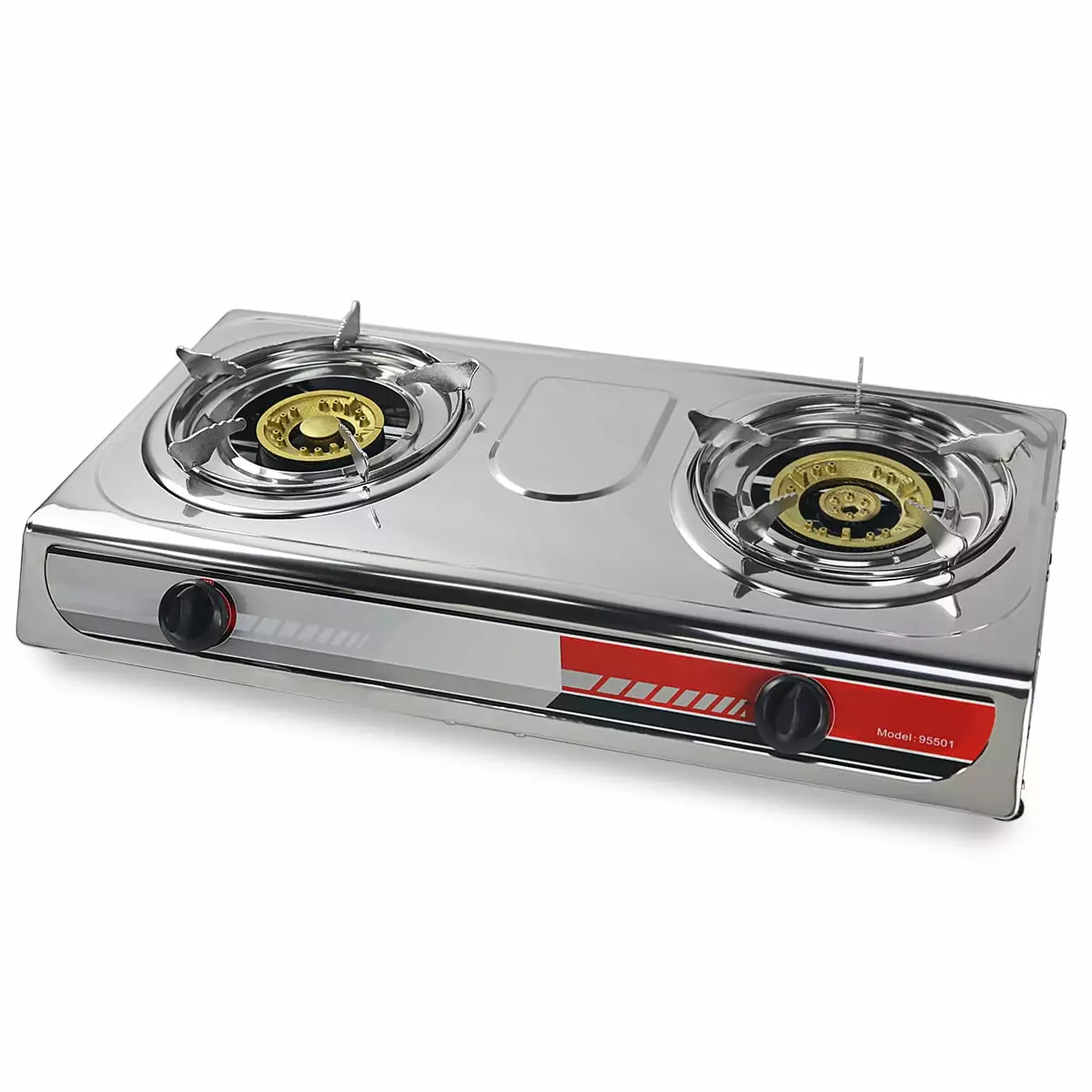 - 2 burner gas stove powered at 12.00 & 15.000 BTU. heats up food quickly and evenly. This camping burner features a control knob to conveniently set the desired temperature for your cooking