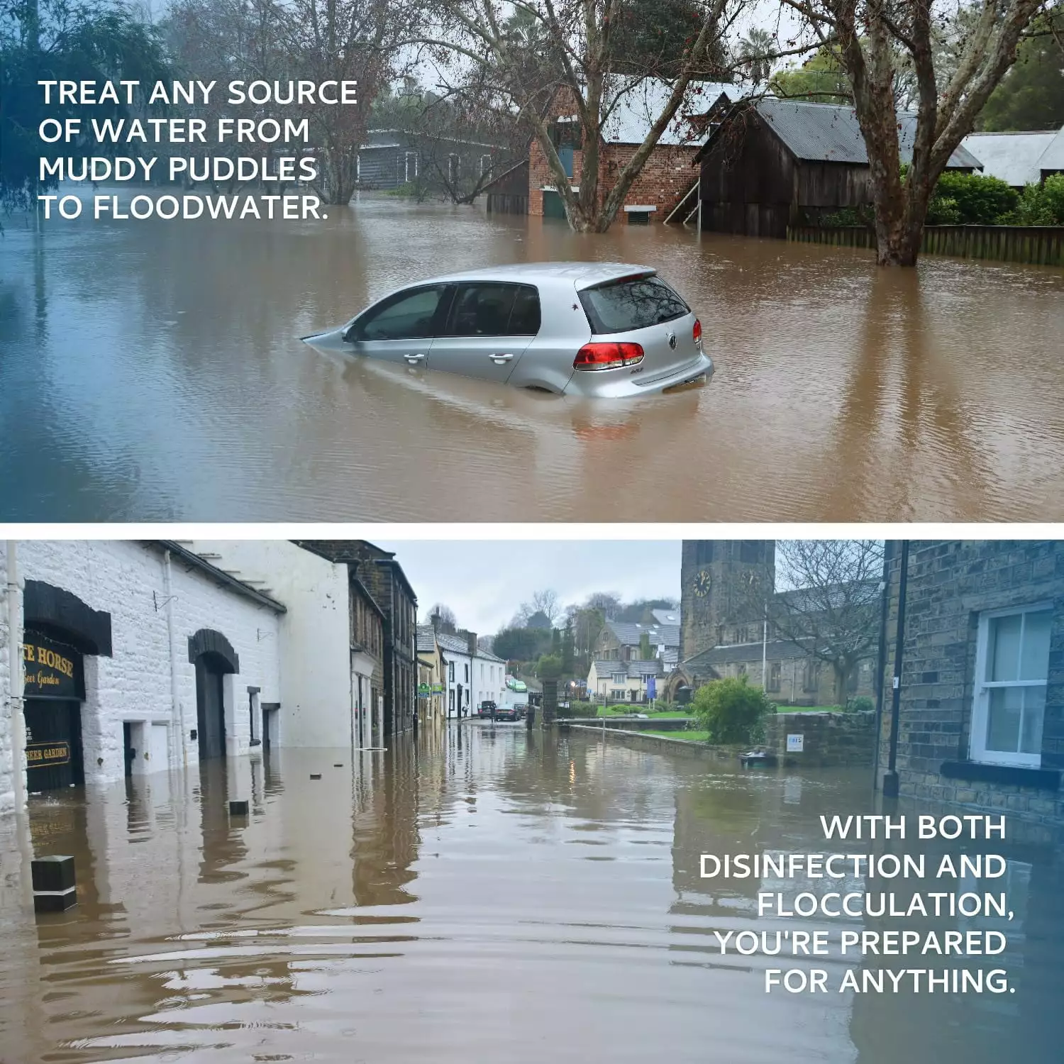 - JUST MIX AND WATCH – See water purification in just 30 minutes. With just one packet you can treat 2.5 gallons or 10 liters of water. Watch the powder take effect and separate dirt from clean water.