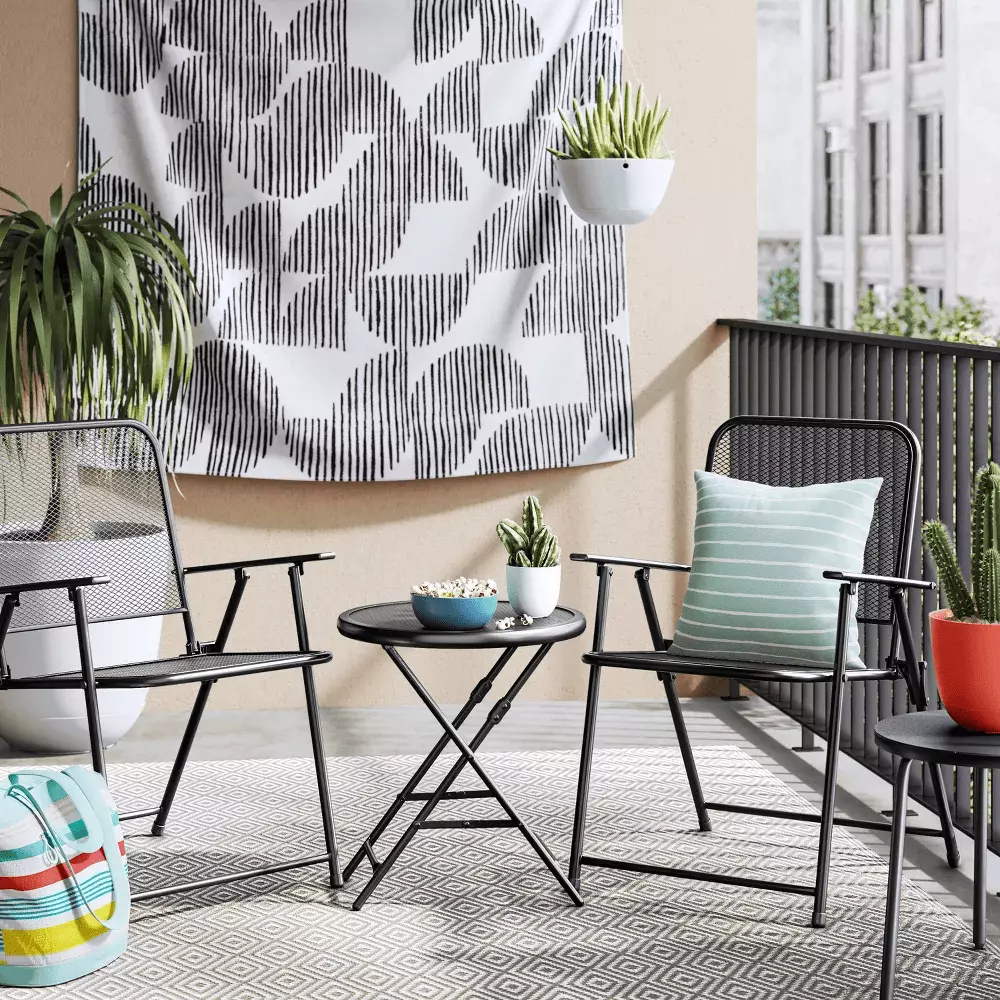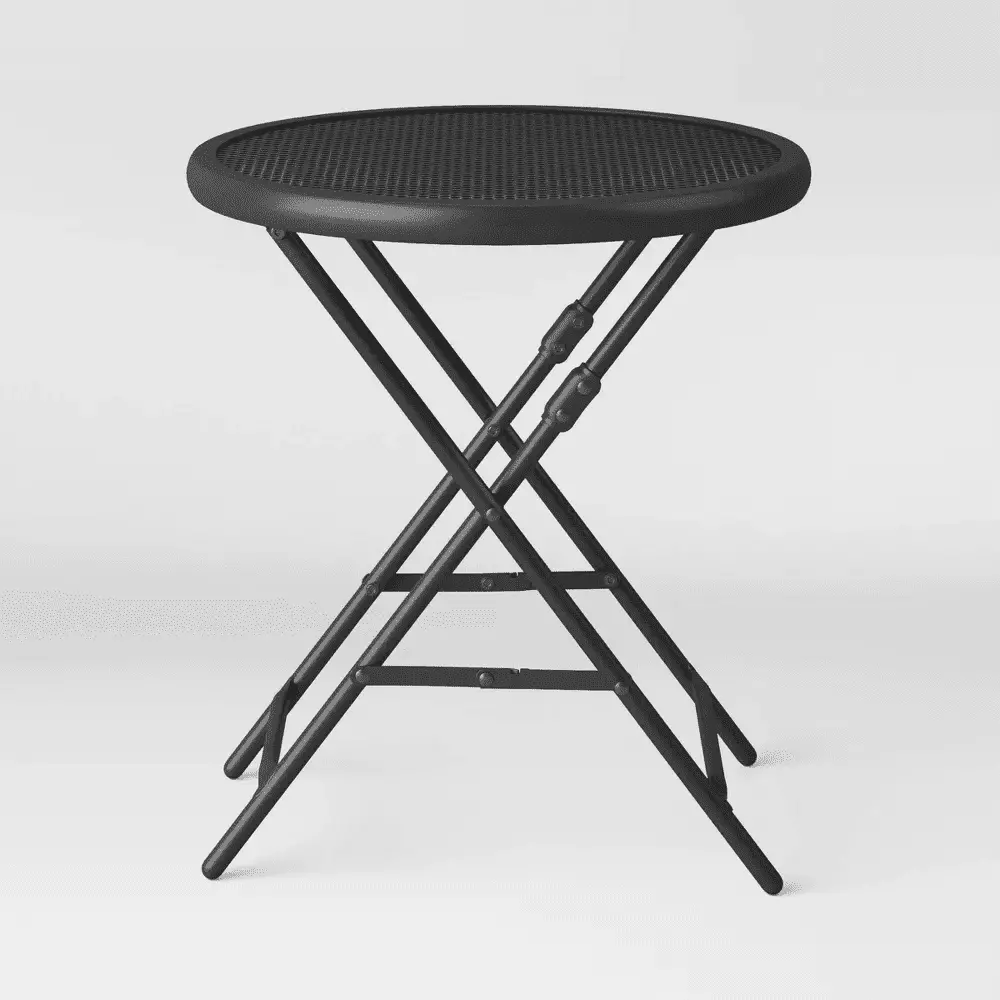 Whether you’re saving space on a small patio or just looking for convenient seasonal furniture with compact storage. this 18-Inch Steel Mesh Patio Folding Table makes a versatile addition to your outdoor furniture. Designed with a steel frame in a rust-resistant black finish. this folding patio table pairs easily with a variety of chairs and other outdoor furnishings and decor. The 20-inch height and 18-inch mesh tabletop diameter provide a convenient footprint for serving drinks and snacks for one or two people or simply perching decorative items like a potted plant or outdoor lantern. Plus. the folding design makes this steel patio table easy to store away between uses or over the winter.