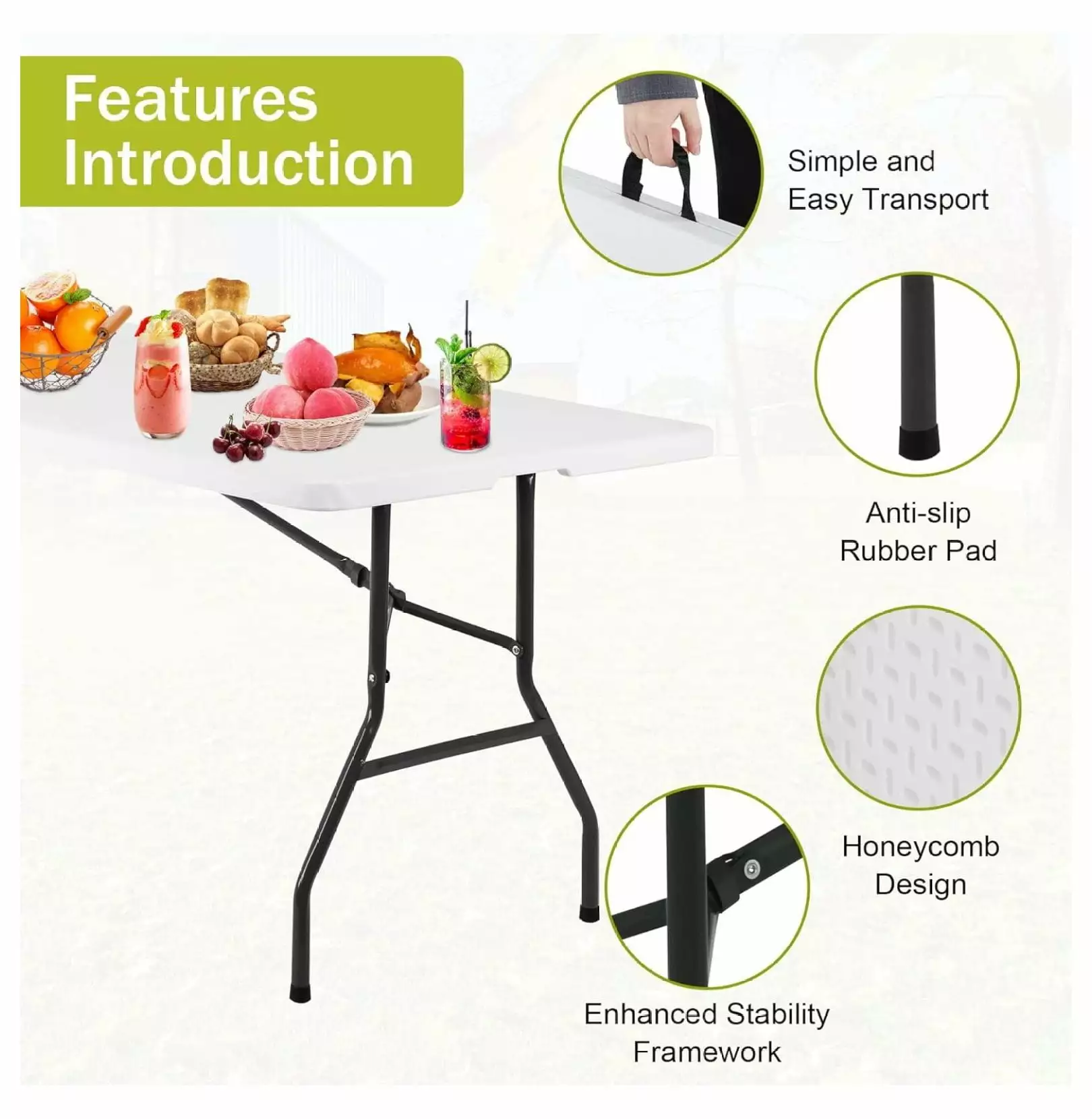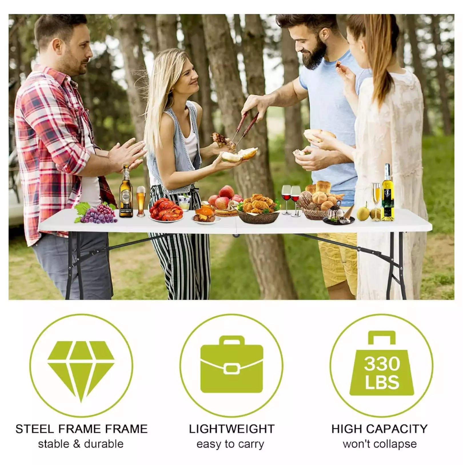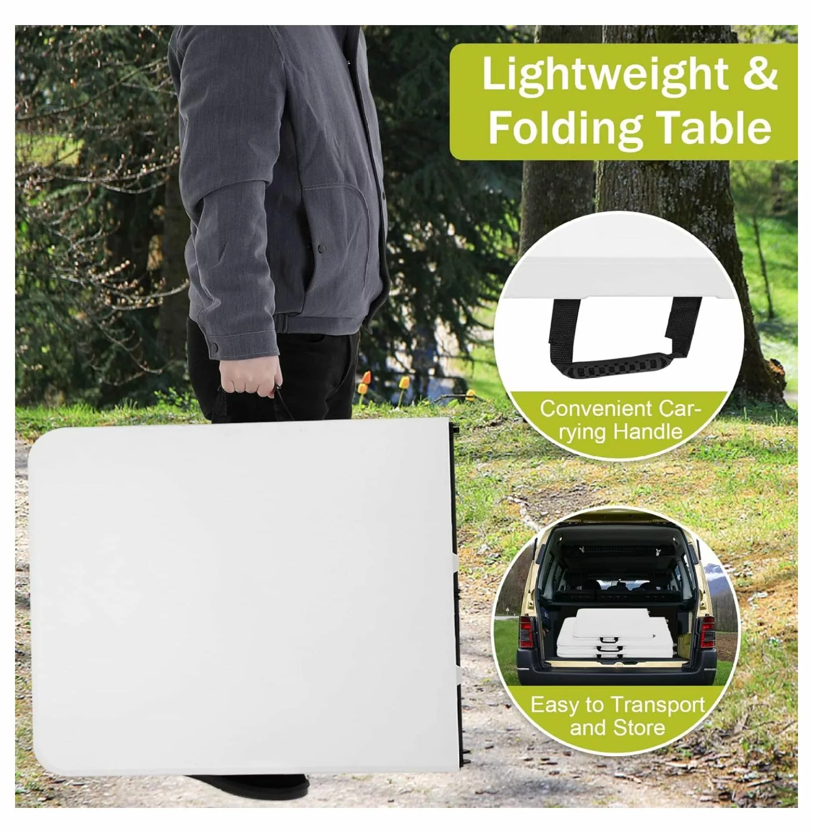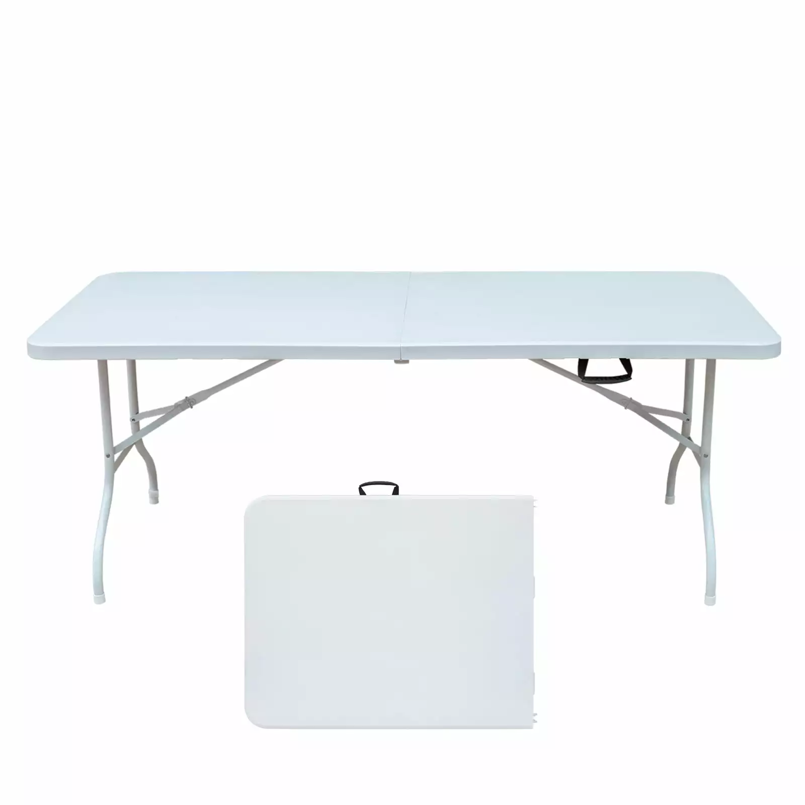 - ??Easy to Store and Move??Our 8ft folding table can be set up in seconds and folded up for compact storage when not in use; the plastic outdoor picnic table comes with a built-in carry handle for effortless carrying. You can easily carry this outdoor table outside with your family and friends for picnics.
