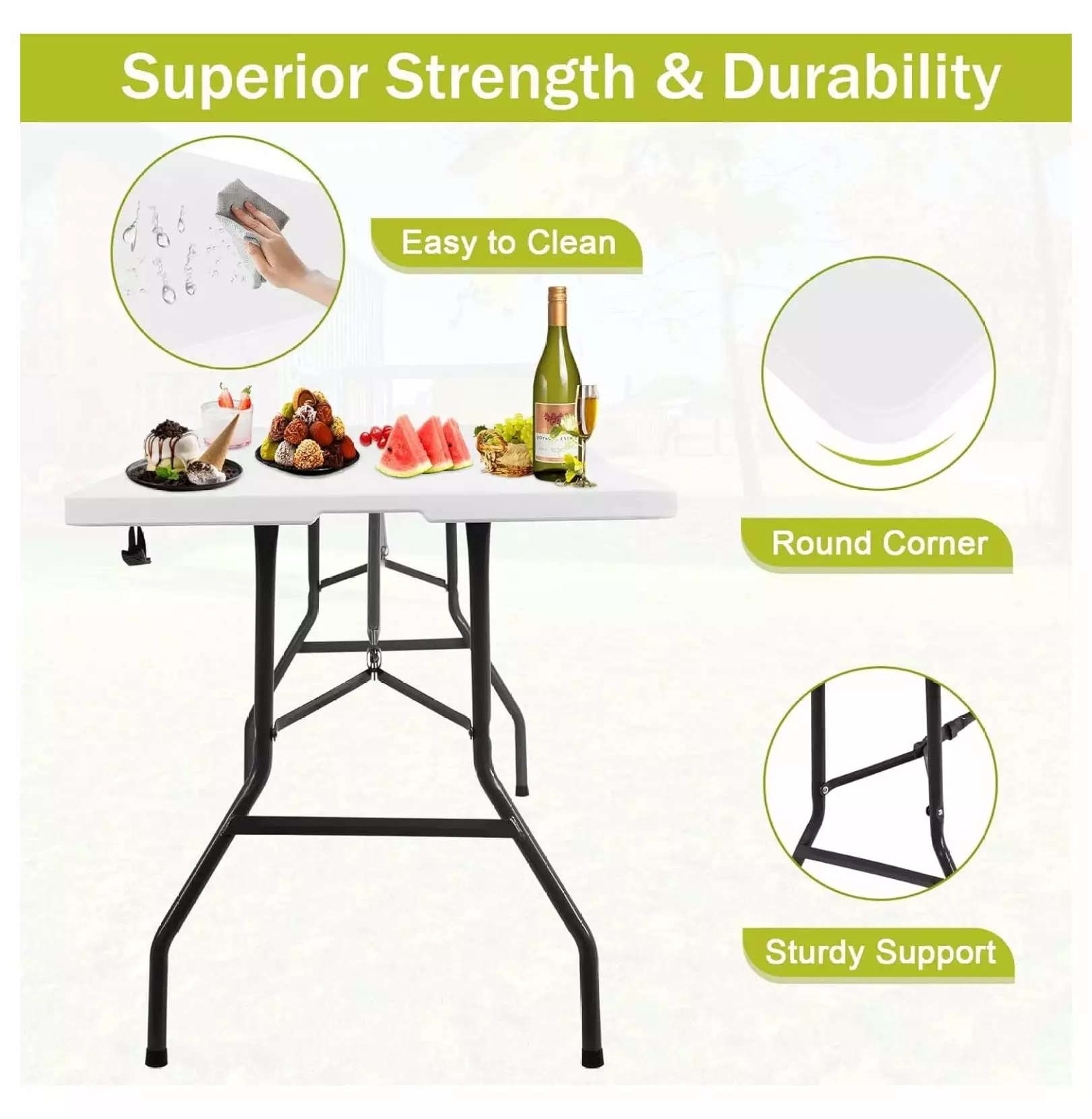 - ??Sturdy Picnic Table??The folding table’s heavy-duty steel frame is complemented by an HDPE table top that is thick enough to be sturdy and resistant to wear and tear; the folding table also features a safety lock and retaining clasp in the middle fold for added stability. making it an ideal outdoor table.