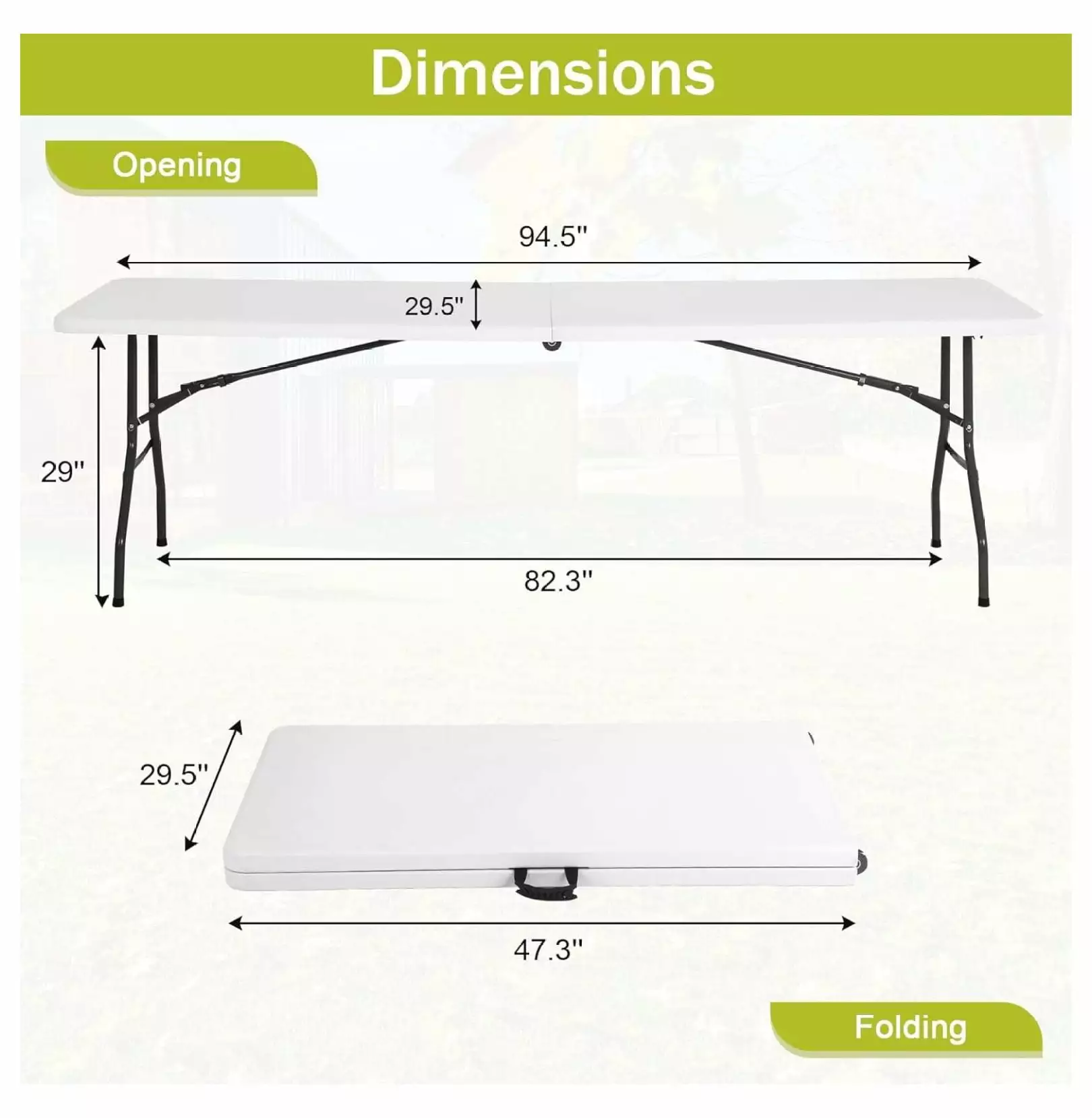 - ??Folding Table Dimensions??The overall dimensions of the plastic picnic table are 94.5×29.5×29(L x W x H). This outdoor folding table is spacious enough to accommodate up to 8 adults. Items such as grills. snacks. fruit and cutlery can also be placed compactly on the 94.5×29.5 wide folding table table top.