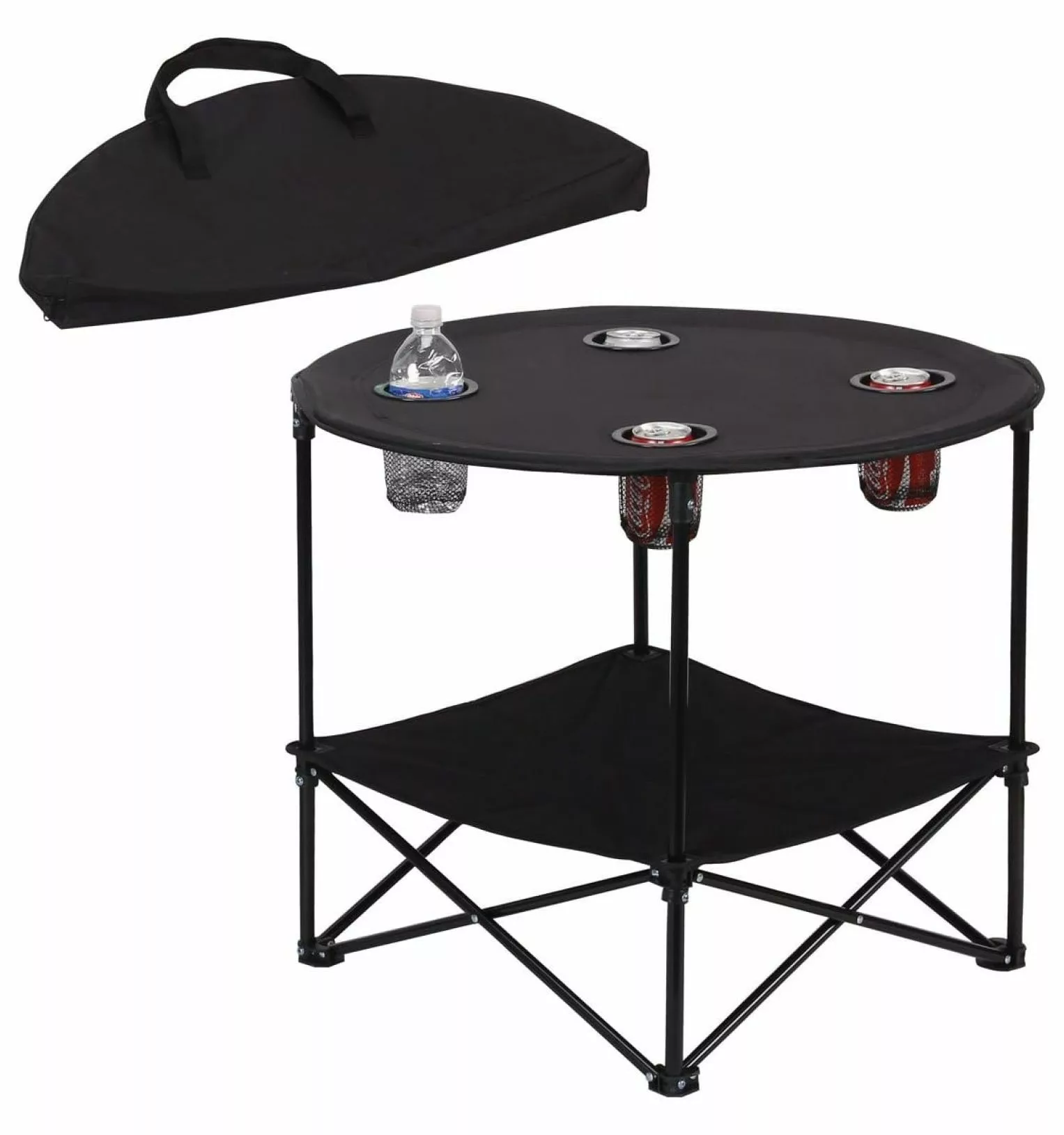 zhou yan jun | 2 Tier Folding Camping Table with 4 Mesh Cup Holders Black | Polyester with Metal Frame | Compact. Convenient Carry Case Included | Side Table for Tailgate