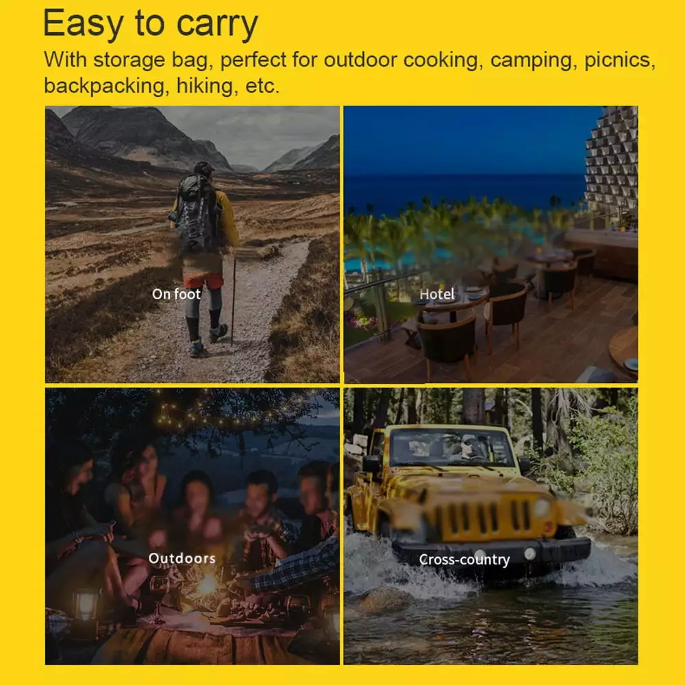 - Compact and lightweight. easy to carry. with storage bag. perfect for outdoor cooking. camping. picnics. backpacking. hiking. etc.